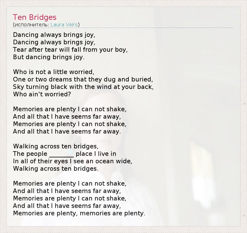 Dancing always brings joy, Dancing always brings joy, Tear after tear will fall from your boy, But dancing brings joy. Who is not a little worried, One or two dreams that they dug and buried, Sky turning black with the wind at your back, Who ain't worried? Memories are plenty I can not shake, And all that I have seems far away, Memories are plenty I can not shake, And all that I have seems far away. Walking across ten bridges, The people ________ place I live in In all of their eyes I see an ocean wide, Walking across ten bridges. Memories are plenty I can not shake, And all that I have seems far away, Memories are plenty I can not shake, And all that I have seems far away, Memories are plenty, memories are plenty.