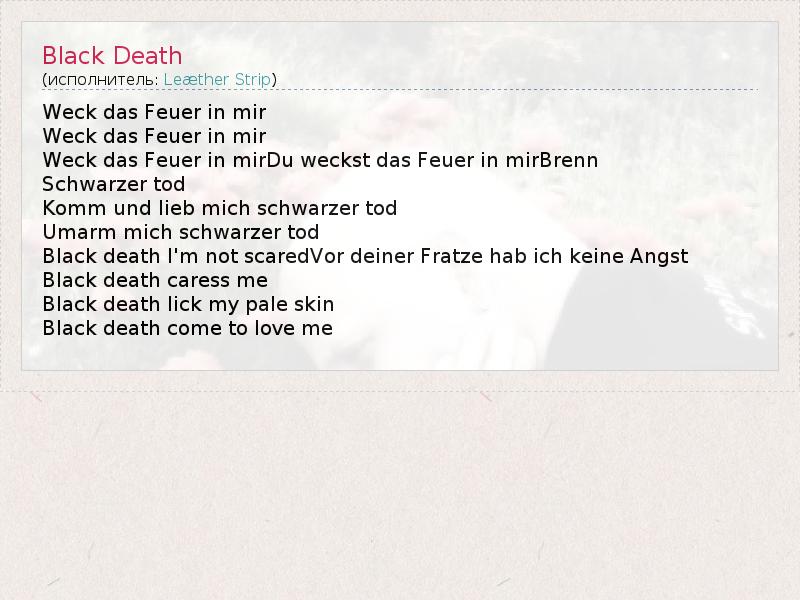 Weck das Feuer in mir Weck das Feuer in mir Weck das Feuer in mirDu weckst das Feuer in mirBrenn Schwarzer tod Komm und lieb mich schwarzer tod Umarm mich schwarzer tod Black death I'm not scaredVor deiner Fratze hab ich keine Angst Black death caress me Black death lick my pale skin Black death come to love me