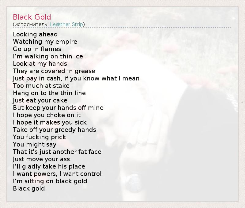 Looking ahead Watching my empire Go up in flames I'm walking on thin ice Look at my hands They are covered in grease Just pay in cash, if you know what I mean Too much at stake Hang on to the thin line Just eat your cake But keep your hands off mine I hope you choke on it I hope it makes you sick Take off your greedy hands You fucking prick You might say That it's just another fat face Just move your ass I'll gladly take his place I want powers, I want control I'm sitting on black gold Black gold