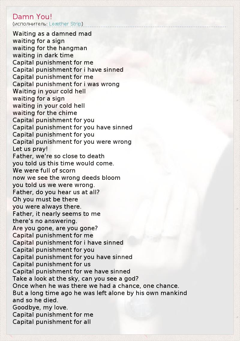 Waiting as a damned mad waiting for a sign waiting for the hangman waiting in dark time Capital punishment for me Capital punishment for i have sinned Capital punishment for me Capital punishment for i was wrong Waiting in your cold hell waiting for a sign waiting in your cold hell waiting for the chime Capital punishment for you Capital punishment for you have sinned Capital punishment for you Capital punishment for you were wrong Let us pray! Father, we're so close to death you told us this time would come. We were full of scorn now we see the wrong deeds bloom you told us we were wrong. Father, do you hear us at all? Oh you must be there you were always there. Father, it nearly seems to me there's no answering. Are you gone, are you gone? Capital punishment for me Capital punishment for i have sinned Capital punishment for you Capital punishment for you have sinned Capital punishment for us Capital punishment for we have sinned Take a look at the sky, can you see a god? Once when he was there we had a chance, one chance. But a long time ago he was left alone by his own mankind and so he died. Goodbye, my love. Capital punishment for me Capital punishment for all