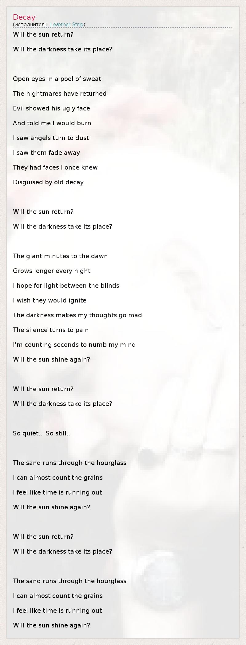 Это интересно:Leæther Strip - музыкальный проект, появившийся в 1988 году. Основателем и единственным музыкантом Leæther Strip является Клаус Ларсен. Впервые это название Ларсен использовал на своих релизах 1989 года. До этого музыкант сочинял по большей части инструментальные трэки. Тем не менее на релизе G.A.W.M.U.S есть демо-треки датированные 82-м и 84-м годом под тем же названием - Leæther Strip. В 1991 году Ларсен начинает также... продолжение