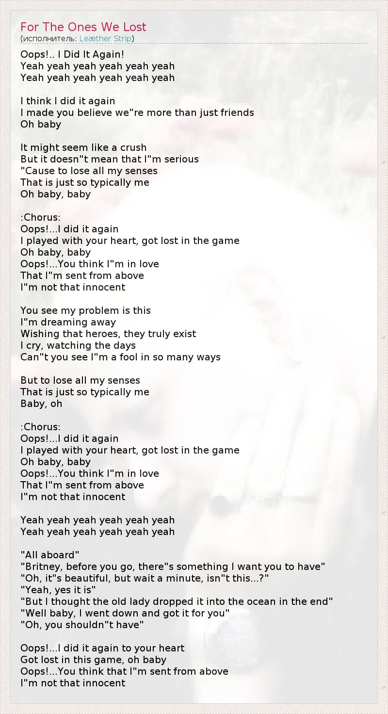 Oops!.. I Did It Again! Yeah yeah yeah yeah yeah yeah Yeah yeah yeah yeah yeah yeah I think I did it again I made you believe we"re more than just friends Oh baby It might seem like a crush But it doesn"t mean that I"m serious "Cause to lose all my senses That is just so typically me Oh baby, baby :Chorus: Oops!...I did it again I played with your heart, got lost in the game Oh baby, baby Oops!...You think I"m in love That I"m sent from above I"m not that innocent You see my problem is this I"m dreaming away Wishing that heroes, they truly exist I cry, watching the days Can"t you see I"m a fool in so many ways But to lose all my senses That is just so typically me Baby, oh :Chorus: Oops!...I did it again I played with your heart, got lost in the game Oh baby, baby Oops!...You think I"m in love That I"m sent from above I"m not that innocent Yeah yeah yeah yeah yeah yeah Yeah yeah yeah yeah yeah yeah "All aboard" "Britney, before you go, there"s something I want you to have" "Oh, it"s beautiful, but wait a minute, isn"t this...?" "Yeah, yes it is" "But I thought the old lady dropped it into the ocean in the end" "Well baby, I went down and got it for you" "Oh, you shouldn"t have" Oops!...I did it again to your heart Got lost in this game, oh baby Oops!...You think that I"m sent from above I"m not that innocent
