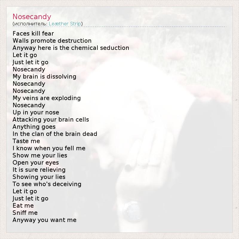 Faces kill fear Walls promote destruction Anyway here is the chemical seduction Let it go Just let it go Nosecandy My brain is dissolving Nosecandy Nosecandy My veins are exploding Nosecandy Up in your nose Attacking your brain cells Anything goes In the clan of the brain dead Taste me I know when you fell me Show me your lies Open your eyes It is sure relieving Showing your lies To see who's deceiving Let it go Just let it go Eat me Sniff me Anyway you want me
