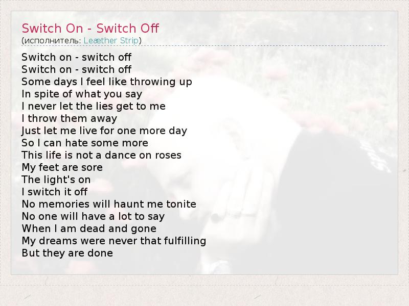 Switch on - switch off Switch on - switch off Some days I feel like throwing up In spite of what you say I never let the lies get to me I throw them away Just let me live for one more day So I can hate some more This life is not a dance on roses My feet are sore The light's on I switch it off No memories will haunt me tonite No one will have a lot to say When I am dead and gone My dreams were never that fulfilling But they are done
