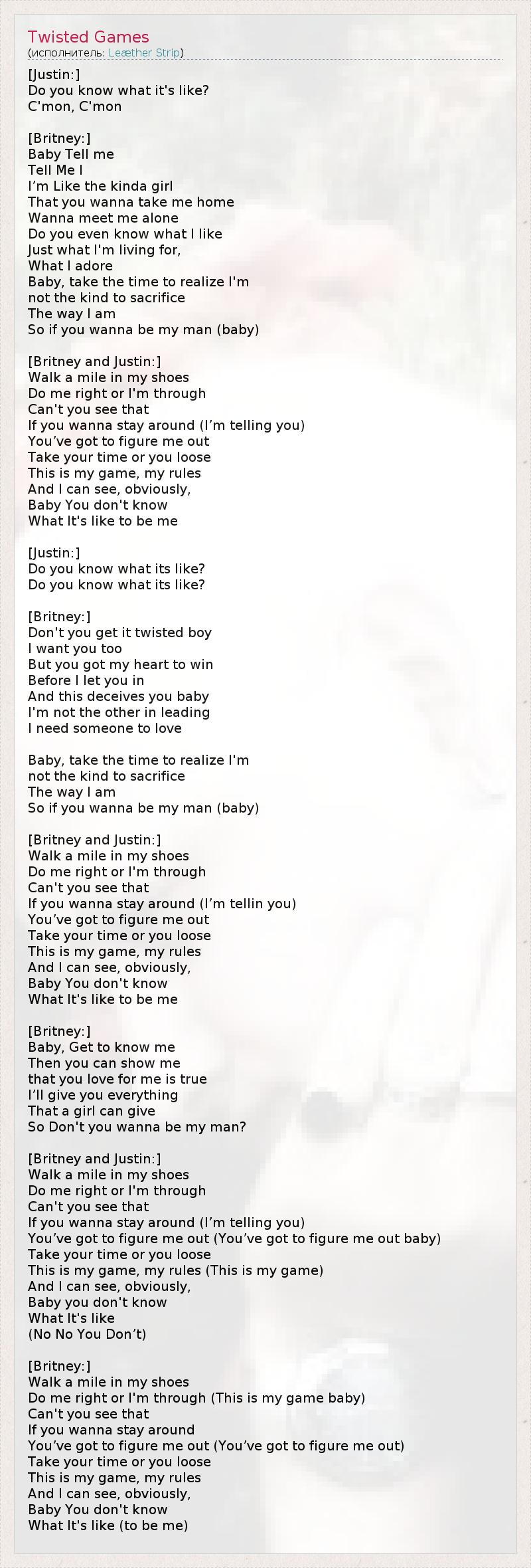 [Джастин:] Ты знаешь, каково это? Давай, давай! [Бритни:] Малыш, скажи мне, Скажи мне, что я Милая девочка И ты хочешь взять меня к себе домой, Хочешь остаться со мной наедине. Ты даже знаешь то, что мне нравится, Ради чего я живу, Что я обожаю. Малыш, дай мне время, чтобы я поняла, что я Не та, которая принесет себя в жертву, Ради того, чтобы быть собой, Так что если ты хочешь стать моим (малыш) [Бритни и Джастин:] Пройди милю в моих ботинках, Признай, что я права во всем, или убирайся прочь. Неужели ты не видишь этого? Если ты хочешь остаться со мной, (скажу тебе), Ты должен понять меня, Не торопись, иначе проиграешь. Это моя игра, мои правила, И я вижу - и это очевидно – Малыш, ты не знаешь, Каково это – быть мной. [Джастин:] Ты знаешь, каково это? Ты знаешь, на что это похоже? [Бритни:] Неужели ты не получил всего, чокнутый мальчик? Я тоже тебя хочу, Но ты получил мое сердце, чтобы выиграть. Перед тем, как я впущу тебя, И это обманет тебя, малыш, Я – не лидер, Мне нужен кто-то, кого я буду любить. Малыш, дай мне время, чтобы я поняла, что я Не та, которая принесет себя в жертву, Ради того, чтобы быть собой, Так что если ты хочешь стать моим (малыш) [Бритни и Джастин:] Пройди милю в моих ботинках, Признай, что я права во всем, или убирайся прочь. Неужели ты не видишь этого? Если ты хочешь остаться со мной, (скажу тебе), Ты должен понять меня, Не торопись, иначе проиграешь. Это моя игра, мои правила, И я вижу - и это очевидно – Малыш, ты не знаешь, Каково это – быть мной. [Бритни:] Малыш, узнай меня, Тогда ты сможешь показать мне, Что твоя любовь ко мне – настоящая. Я отдам тебе все, Что только может отдать девушка, Так ты хочешь стать моим? [Бритни и Джастин:] Пройди милю в моих ботинках, Признай, что я права во всем, или убирайся прочь. Неужели ты не видишь этого? Если ты хочешь остаться со мной, (скажу тебе), Ты должен понять меня, (Ты должен понять меня) Не торопись, иначе проиграешь. Это моя игра, мои правила, (Это моя игра) И я вижу - и это очевидно – Малыш, ты не знаешь, Каково это... (Нет, нет, ты не знаешь) [Бритни:] Пройди милю в моих ботинках, Признай, что я права во всем, или убирайся прочь.(Это моя игра, малыш) Неужели ты не видишь этого? Если ты хочешь остаться со мной, Ты должен понять меня, (Ты должен понять меня) Не торопись, иначе проиграешь. Это моя игра, мои правила, (Это моя игра) И я вижу - и это очевидно – Малыш, ты не знаешь, Каково это ... (быть мной)