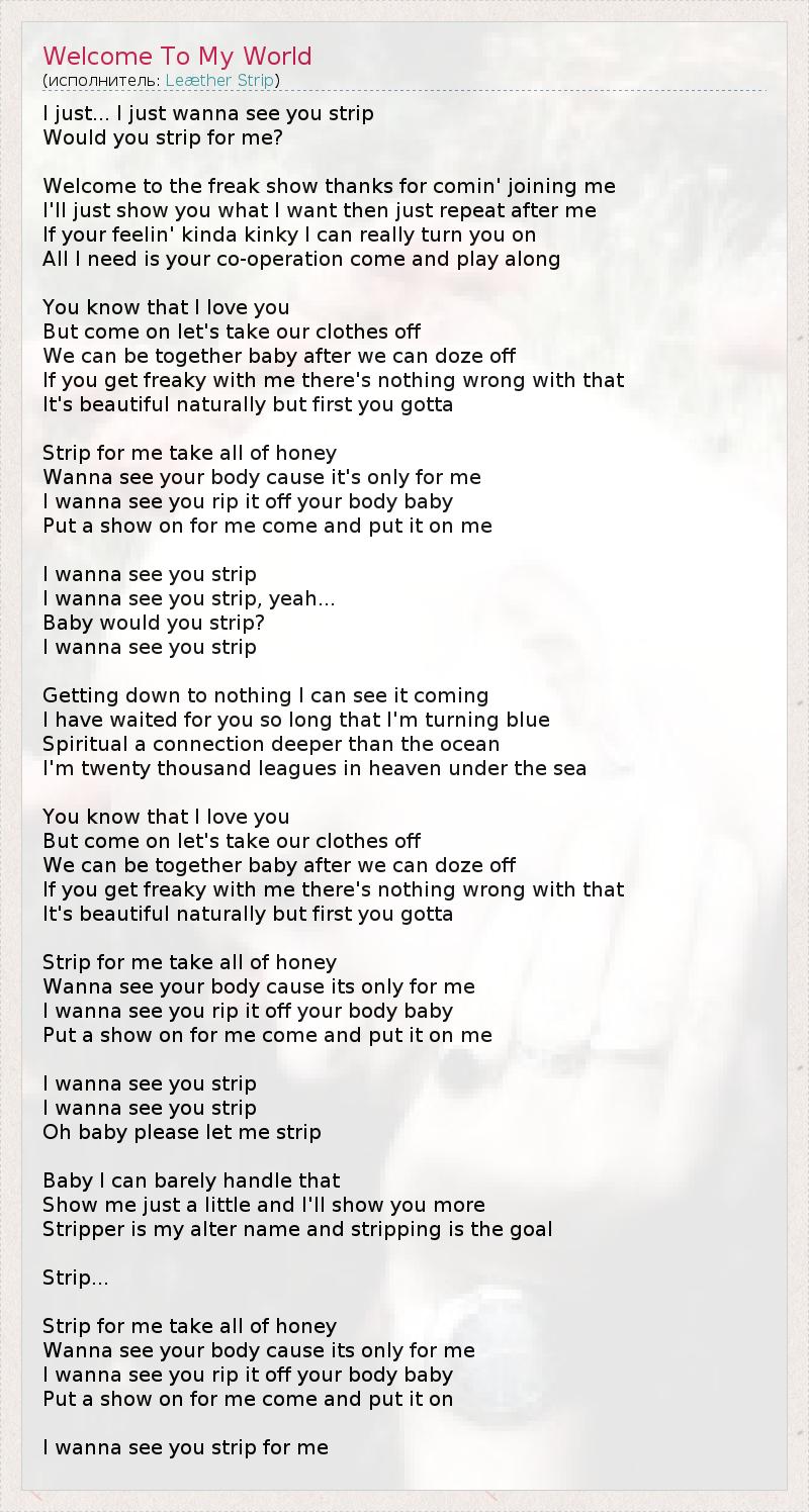 Я просто... Я просто хочу увидеть, как ты раздеваешься... Ты разделся бы для меня? Добро пожаловать на шоу! Спасибо, что присоединился ко мне! Я просто покажу, чего хочу, а ты - повторяй за мной. Если тебе не по себе, то я могу завести тебя. Мне нужно лишь чтобы ты помог мне, подыграв... Ты знаешь, что я люблю тебя, Так давай же скорее снимем одежду... Мы можем быть вместе малыш, а после можем подремать... Если со мной у тебя сносит башню, в этом нет ничего такого - Это красиво и естественно, но для начала ты должен... Раздеться для меня, сними все, милый! Я хочу видеть твое тело - оно только для меня... Я хочу увидеть, как ты срываешь все со своего тела малыш... Устрой для меня шоу и то, что за ним последует... Я хочу увидеть, как ты раздеваешься, Я хочу увидеть, как ты раздеваешься, о да! Малыш, ты разденешься? Я хочу увидеть, как ты раздеваешься... Ни к чему не переходим, хотя я вижу, что всё скоро будет... Я так долго ждала тебя, что начинаю грустить. Духовная связь глубже, чем океан, Я двадцать тысяч лье в небесах под морем... Ты знаешь, что я люблю тебя, Так давай же скорее снимем одежду... Мы можем быть вместе малыш, а после можем подремать... Если со мной у тебя сносит башню, в этом нет ничего такого - Это красиво и естественно, но для начала ты должен... Раздеться для меня, сними все, милый! Я хочу видеть твое тело - оно только для меня... Я хочу увидеть, как ты срываешь все со своего тела малыш... Устрой для меня шоу и то, что за ним последует... Я хочу увидеть, как ты раздеваешься, Я хочу увидеть, как ты раздеваешься, о да! О, малыш, прошу, позволь мне раздеться! Малыш, я вряд ли смогу справиться с этим, Просто покажи мне немного, а я покажу тебе больше... Стриптизерша - мое второе "Я", и моя цель - раздеться. Раздеться... Разденься для меня, сними все, милый! Я хочу видеть твое тело - оно только для меня... Я хочу увидеть, как ты срываешь все со своего тела малыш... Устрой для меня шоу и то, что за ним последует... Я хочу увидеть, как ты раздеваешься для меня...