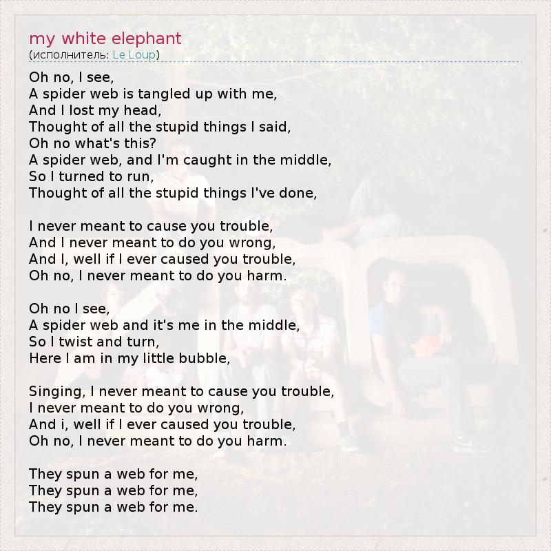Oh no, I see, A spider web is tangled up with me, And I lost my head, Thought of all the stupid things I said, Oh no what's this? A spider web, and I'm caught in the middle, So I turned to run, Thought of all the stupid things I've done, I never meant to cause you trouble, And I never meant to do you wrong, And I, well if I ever caused you trouble, Oh no, I never meant to do you harm. Oh no I see, A spider web and it's me in the middle, So I twist and turn, Here I am in my little bubble, Singing, I never meant to cause you trouble, I never meant to do you wrong, And i, well if I ever caused you trouble, Oh no, I never meant to do you harm. They spun a web for me, They spun a web for me, They spun a web for me.