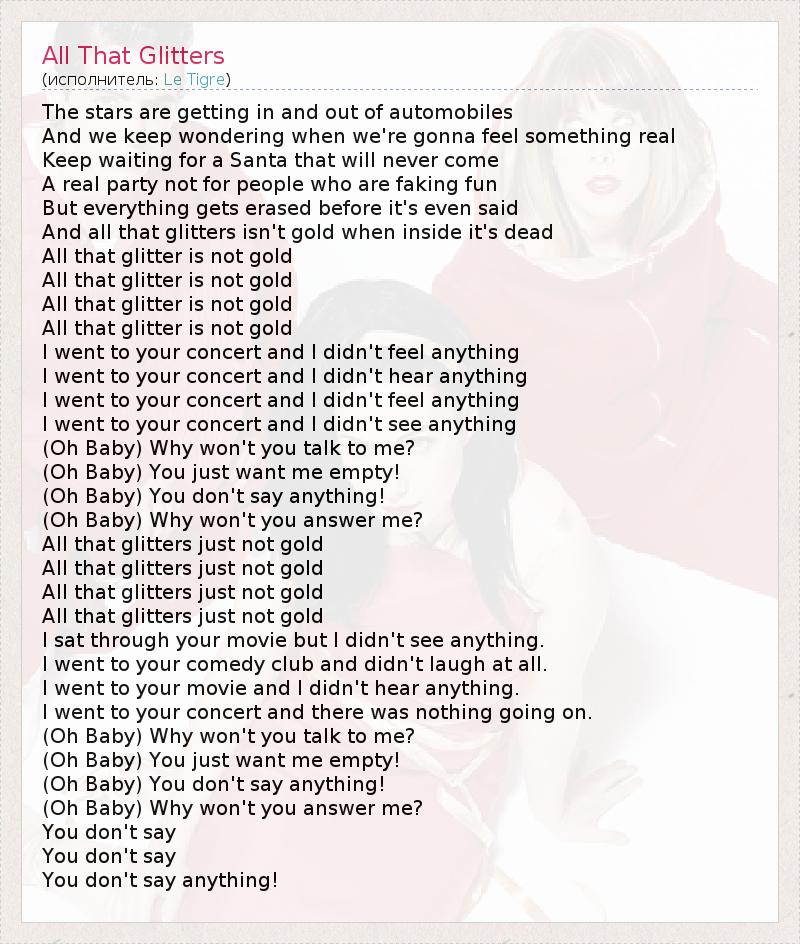 The stars are getting in and out of automobiles And we keep wondering when we're gonna feel something real Keep waiting for a Santa that will never come A real party not for people who are faking fun But everything gets erased before it's even said And all that glitters isn't gold when inside it's dead All that glitter is not gold All that glitter is not gold All that glitter is not gold All that glitter is not gold I went to your concert and I didn't feel anything I went to your concert and I didn't hear anything I went to your concert and I didn't feel anything I went to your concert and I didn't see anything (Oh Baby) Why won't you talk to me? (Oh Baby) You just want me empty! (Oh Baby) You don't say anything! (Oh Baby) Why won't you answer me? All that glitters just not gold All that glitters just not gold All that glitters just not gold All that glitters just not gold I sat through your movie but I didn't see anything. I went to your comedy club and didn't laugh at all. I went to your movie and I didn't hear anything. I went to your concert and there was nothing going on. (Oh Baby) Why won't you talk to me? (Oh Baby) You just want me empty! (Oh Baby) You don't say anything! (Oh Baby) Why won't you answer me? You don't say You don't say You don't say anything!
