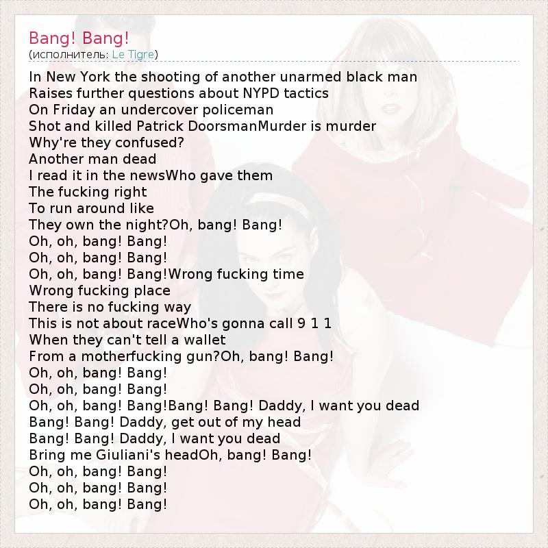 In New York the shooting of another unarmed black man Raises further questions about NYPD tactics On Friday an undercover policeman Shot and killed Patrick DoorsmanMurder is murder Why're they confused? Another man dead I read it in the newsWho gave them The fucking right To run around like They own the night?Oh, bang! Bang! Oh, oh, bang! Bang! Oh, oh, bang! Bang! Oh, oh, bang! Bang!Wrong fucking time Wrong fucking place There is no fucking way This is not about raceWho's gonna call 9 1 1 When they can't tell a wallet From a motherfucking gun?Oh, bang! Bang! Oh, oh, bang! Bang! Oh, oh, bang! Bang! Oh, oh, bang! Bang!Bang! Bang! Daddy, I want you dead Bang! Bang! Daddy, get out of my head Bang! Bang! Daddy, I want you dead Bring me Giuliani's headOh, bang! Bang! Oh, oh, bang! Bang! Oh, oh, bang! Bang! Oh, oh, bang! Bang!