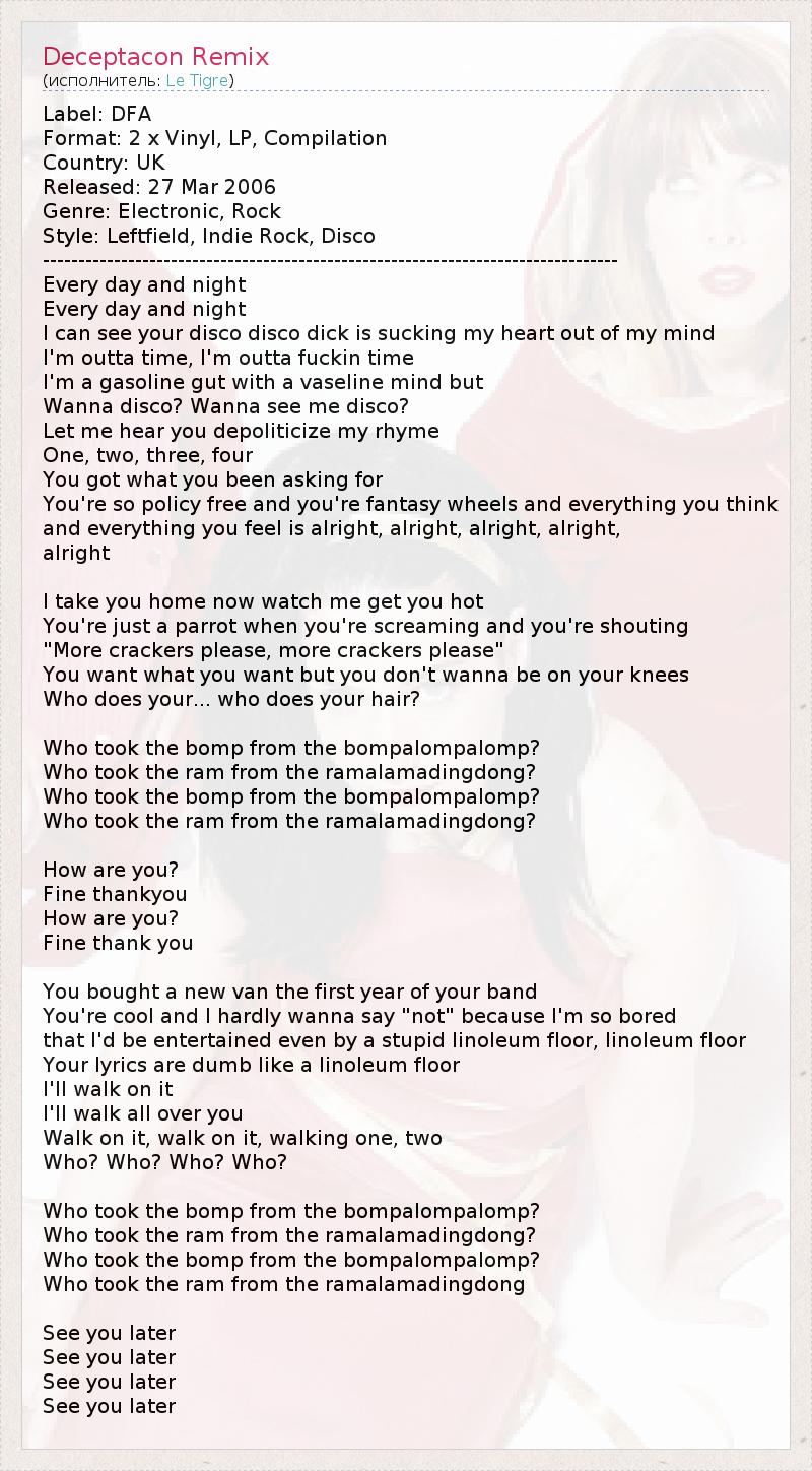 Label: DFA Format: 2 x Vinyl, LP, Compilation Country: UK Released: 27 Mar 2006 Genre: Electronic, Rock Style: Leftfield, Indie Rock, Disco --------------------------------------------------------------------------------- Every day and night Every day and night I can see your disco disco dick is sucking my heart out of my mind I'm outta time, I'm outta fuckin time I'm a gasoline gut with a vaseline mind but Wanna disco? Wanna see me disco? Let me hear you depoliticize my rhyme One, two, three, four You got what you been asking for You're so policy free and you're fantasy wheels and everything you think and everything you feel is alright, alright, alright, alright, alright I take you home now watch me get you hot You're just a parrot when you're screaming and you're shouting "More crackers please, more crackers please" You want what you want but you don't wanna be on your knees Who does your... who does your hair? Who took the bomp from the bompalompalomp? Who took the ram from the ramalamadingdong? Who took the bomp from the bompalompalomp? Who took the ram from the ramalamadingdong? How are you? Fine thankyou How are you? Fine thank you You bought a new van the first year of your band You're cool and I hardly wanna say "not" because I'm so bored that I'd be entertained even by a stupid linoleum floor, linoleum floor Your lyrics are dumb like a linoleum floor I'll walk on it I'll walk all over you Walk on it, walk on it, walking one, two Who? Who? Who? Who? Who took the bomp from the bompalompalomp? Who took the ram from the ramalamadingdong? Who took the bomp from the bompalompalomp? Who took the ram from the ramalamadingdong See you later See you later See you later See you later