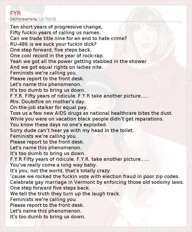 Это интересно:В ответ на часто задаваемые вопросы о Riot Grrrl: «Что это было? Что с ним случилось? Далеко ли они с ним продвинулись?» - Kathleen Hanna, Johanna Fateman and J. D. Samson из Le Tigre, скорее всего, пожмут плечами, пытаясь вспомнить и начать с того места, где остановились в своих продолжительных дискуссиях о еще незаконченном концептуальном арт-проекте Riot Grrrl: the remixes. Идея сделать из Riot Grrrl и Queercore популярную танцевальную... продолжение