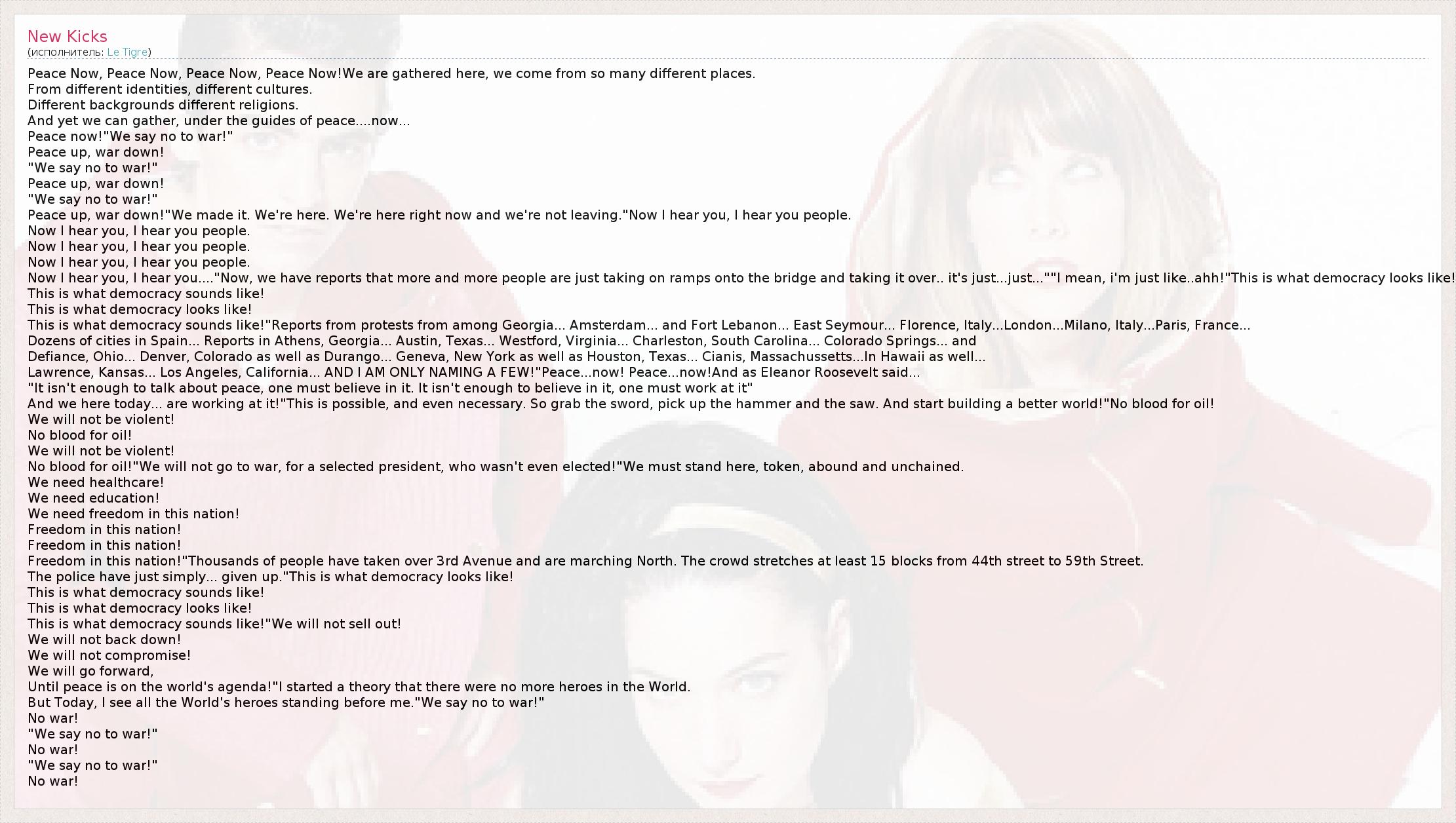 Peace Now, Peace Now, Peace Now, Peace Now!We are gathered here, we come from so many different places. From different identities, different cultures. Different backgrounds different religions. And yet we can gather, under the guides of peace....now... Peace now!"We say no to war!" Peace up, war down! "We say no to war!" Peace up, war down! "We say no to war!" Peace up, war down!"We made it. We're here. We're here right now and we're not leaving."Now I hear you, I hear you people. Now I hear you, I hear you people. Now I hear you, I hear you people. Now I hear you, I hear you people. Now I hear you, I hear you...."Now, we have reports that more and more people are just taking on ramps onto the bridge and taking it over.. it's just...just...""I mean, i'm just like..ahh!"This is what democracy looks like! This is what democracy sounds like! This is what democracy looks like! This is what democracy sounds like!"Reports from protests from among Georgia... Amsterdam... and Fort Lebanon... East Seymour... Florence, Italy...London...Milano, Italy...Paris, France... Dozens of cities in Spain... Reports in Athens, Georgia... Austin, Texas... Westford, Virginia... Charleston, South Carolina... Colorado Springs... and Defiance, Ohio... Denver, Colorado as well as Durango... Geneva, New York as well as Houston, Texas... Cianis, Massachussetts...In Hawaii as well... Lawrence, Kansas... Los Angeles, California... AND I AM ONLY NAMING A FEW!"Peace...now! Peace...now!And as Eleanor Roosevelt said... "It isn't enough to talk about peace, one must believe in it. It isn't enough to believe in it, one must work at it" And we here today... are working at it!"This is possible, and even necessary. So grab the sword, pick up the hammer and the saw. And start building a better world!"No blood for oil! We will not be violent! No blood for oil! We will not be violent! No blood for oil!"We will not go to war, for a selected president, who wasn't even elected!"We must stand here, token, abound and unchained. We need healthcare! We need education! We need freedom in this nation! Freedom in this nation! Freedom in this nation! Freedom in this nation!"Thousands of people have taken over 3rd Avenue and are marching North. The crowd stretches at least 15 blocks from 44th street to 59th Street. The police have just simply... given up."This is what democracy looks like! This is what democracy sounds like! This is what democracy looks like! This is what democracy sounds like!"We will not sell out! We will not back down! We will not compromise! We will go forward, Until peace is on the world's agenda!"I started a theory that there were no more heroes in the World. But Today, I see all the World's heroes standing before me."We say no to war!" No war! "We say no to war!" No war! "We say no to war!" No war!