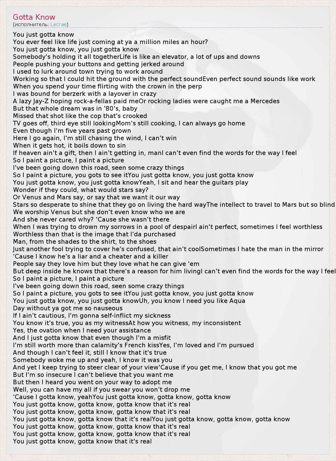 'Cause I gotta know, yeahYou just gotta know, gotta know, gotta know