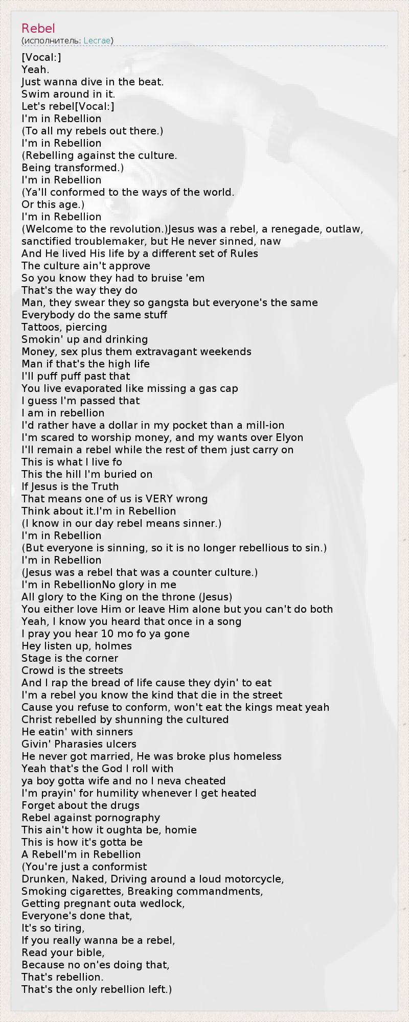[Vocal:] Yeah. Just wanna dive in the beat. Swim around in it. Let's rebel[Vocal:] I'm in Rebellion (To all my rebels out there.) I'm in Rebellion (Rebelling against the culture. Being transformed.) I'm in Rebellion (Ya'll conformed to the ways of the world. Or this age.) I'm in Rebellion (Welcome to the revolution.)Jesus was a rebel, a renegade, outlaw, sanctified troublemaker, but He never sinned, naw And He lived His life by a different set of Rules The culture ain't approve So you know they had to bruise 'em That's the way they do Man, they swear they so gangsta but everyone's the same Everybody do the same stuff Tattoos, piercing Smokin' up and drinking Money, sex plus them extravagant weekends Man if that's the high life I'll puff puff past that You live evaporated like missing a gas cap I guess I'm passed that I am in rebellion I'd rather have a dollar in my pocket than a mill-ion I'm scared to worship money, and my wants over Elyon I'll remain a rebel while the rest of them just carry on This is what I live fo This the hill I'm buried on If Jesus is the Truth That means one of us is VERY wrong Think about it.I'm in Rebellion (I know in our day rebel means sinner.) I'm in Rebellion (But everyone is sinning, so it is no longer rebellious to sin.) I'm in Rebellion (Jesus was a rebel that was a counter culture.) I'm in RebellionNo glory in me All glory to the King on the throne (Jesus) You either love Him or leave Him alone but you can't do both Yeah, I know you heard that once in a song I pray you hear 10 mo fo ya gone Hey listen up, holmes Stage is the corner Crowd is the streets And I rap the bread of life cause they dyin' to eat I'm a rebel you know the kind that die in the street Cause you refuse to conform, won't eat the kings meat yeah Christ rebelled by shunning the cultured He eatin' with sinners Givin' Pharasies ulcers He never got married, He was broke plus homeless Yeah that's the God I roll with ya boy gotta wife and no I neva cheated I'm prayin' for humility whenever I get heated Forget about the drugs Rebel against pornography This ain't how it oughta be, homie This is how it's gotta be A RebelI'm in Rebellion (You're just a conformist Drunken, Naked, Driving around a loud motorcycle, Smoking cigarettes, Breaking commandments, Getting pregnant outa wedlock, Everyone's done that, It's so tiring, If you really wanna be a rebel, Read your bible, Because no on'es doing that, That's rebellion. That's the only rebellion left.)