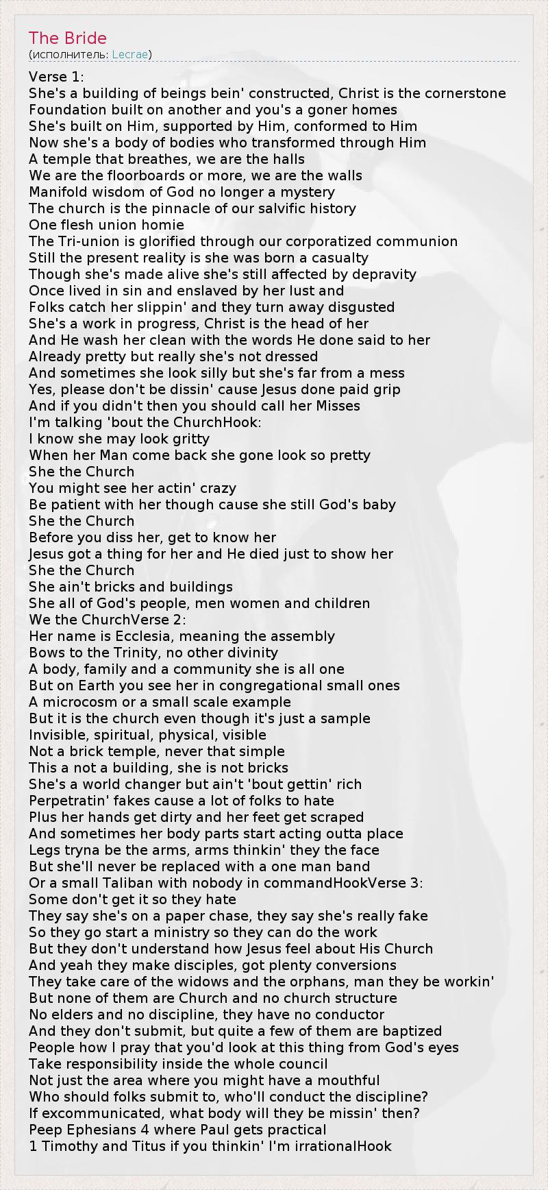 Verse 1: She's a building of beings bein' constructed, Christ is the cornerstone Foundation built on another and you's a goner homes She's built on Him, supported by Him, conformed to Him Now she's a body of bodies who transformed through Him A temple that breathes, we are the halls We are the floorboards or more, we are the walls Manifold wisdom of God no longer a mystery The church is the pinnacle of our salvific history One flesh union homie The Tri-union is glorified through our corporatized communion Still the present reality is she was born a casualty Though she's made alive she's still affected by depravity Once lived in sin and enslaved by her lust and Folks catch her slippin' and they turn away disgusted She's a work in progress, Christ is the head of her And He wash her clean with the words He done said to her Already pretty but really she's not dressed And sometimes she look silly but she's far from a mess Yes, please don't be dissin' cause Jesus done paid grip And if you didn't then you should call her Misses I'm talking 'bout the ChurchHook: I know she may look gritty When her Man come back she gone look so pretty She the Church You might see her actin' crazy Be patient with her though cause she still God's baby She the Church Before you diss her, get to know her Jesus got a thing for her and He died just to show her She the Church She ain't bricks and buildings She all of God's people, men women and children We the ChurchVerse 2: Her name is Ecclesia, meaning the assembly Bows to the Trinity, no other divinity A body, family and a community she is all one But on Earth you see her in congregational small ones A microcosm or a small scale example But it is the church even though it's just a sample Invisible, spiritual, physical, visible Not a brick temple, never that simple This a not a building, she is not bricks She's a world changer but ain't 'bout gettin' rich Perpetratin' fakes cause a lot of folks to hate Plus her hands get dirty and her feet get scraped And sometimes her body parts start acting outta place Legs tryna be the arms, arms thinkin' they the face But she'll never be replaced with a one man band Or a small Taliban with nobody in commandHookVerse 3: Some don't get it so they hate They say she's on a paper chase, they say she's really fake So they go start a ministry so they can do the work But they don't understand how Jesus feel about His Church And yeah they make disciples, got plenty conversions They take care of the widows and the orphans, man they be workin' But none of them are Church and no church structure No elders and no discipline, they have no conductor And they don't submit, but quite a few of them are baptized People how I pray that you'd look at this thing from God's eyes Take responsibility inside the whole council Not just the area where you might have a mouthful Who should folks submit to, who'll conduct the discipline? If excommunicated, what body will they be missin' then? Peep Ephesians 4 where Paul gets practical 1 Timothy and Titus if you thinkin' I'm irrationalHook