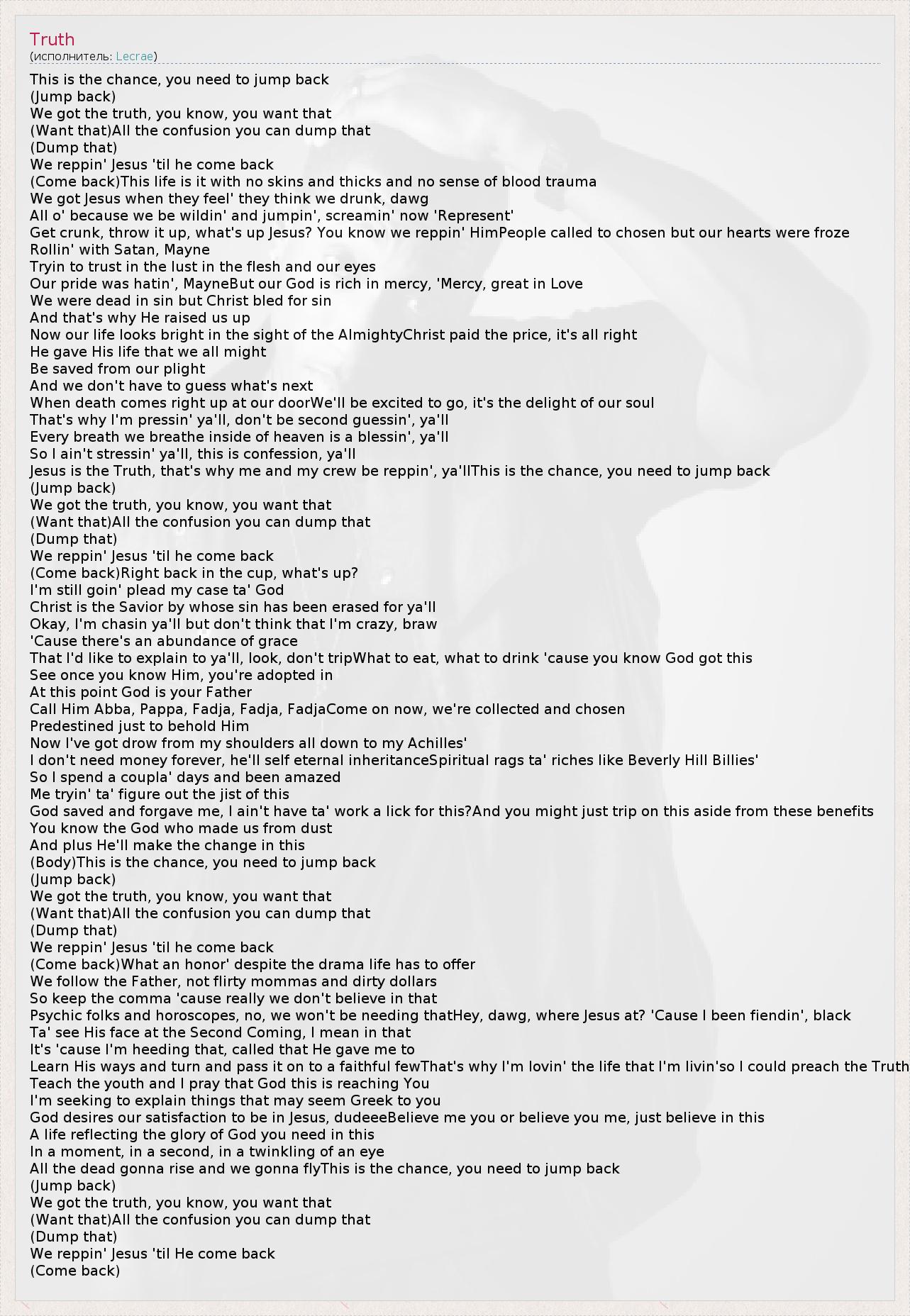 Jesus is the Truth, that's why me and my crew be reppin', ya'llThis is the chance, you need to jump back