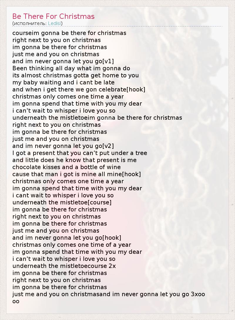 courseim gonna be there for christmas right next to you on christmas im gonna be there for christmas just me and you on christmas and im never gonna let you go[v1] Been thinking all day what im gonna do its almost christmas gotta get home to you my baby waiting and i cant be late and when i get there we gon celebrate[hook] christmas only comes one time a year im gonna spend that time with you my dear i can't wait to whisper i love you so underneath the mistletoeim gonna be there for christmas right next to you on christmas im gonna be there for christmas just me and you on christmas and im never gonna let you go[v2] I got a present that you can't put under a tree and little does he know that present is me chocolate kisses and a bottle of wine cause that man i got is mine all mine[hook] christmas only comes one time a year im gonna spend that time with you my dear i cant wait to whisper i love you so underneath the mistletoe[course] im gonna be there for christmas right next to you on christmas im gonna be there for christmas just me and you on christmas and im never gonna let you go[hook] christmas only comes one time of a year im gonna spend that time with you my dear i can't wait to whisper i love you so underneath the mistletoecourse 2x im gonna be there for christmas right next to you on christmas im gonna be there for christmas just me and you on christmasand im never gonna let you go 3xoo oo