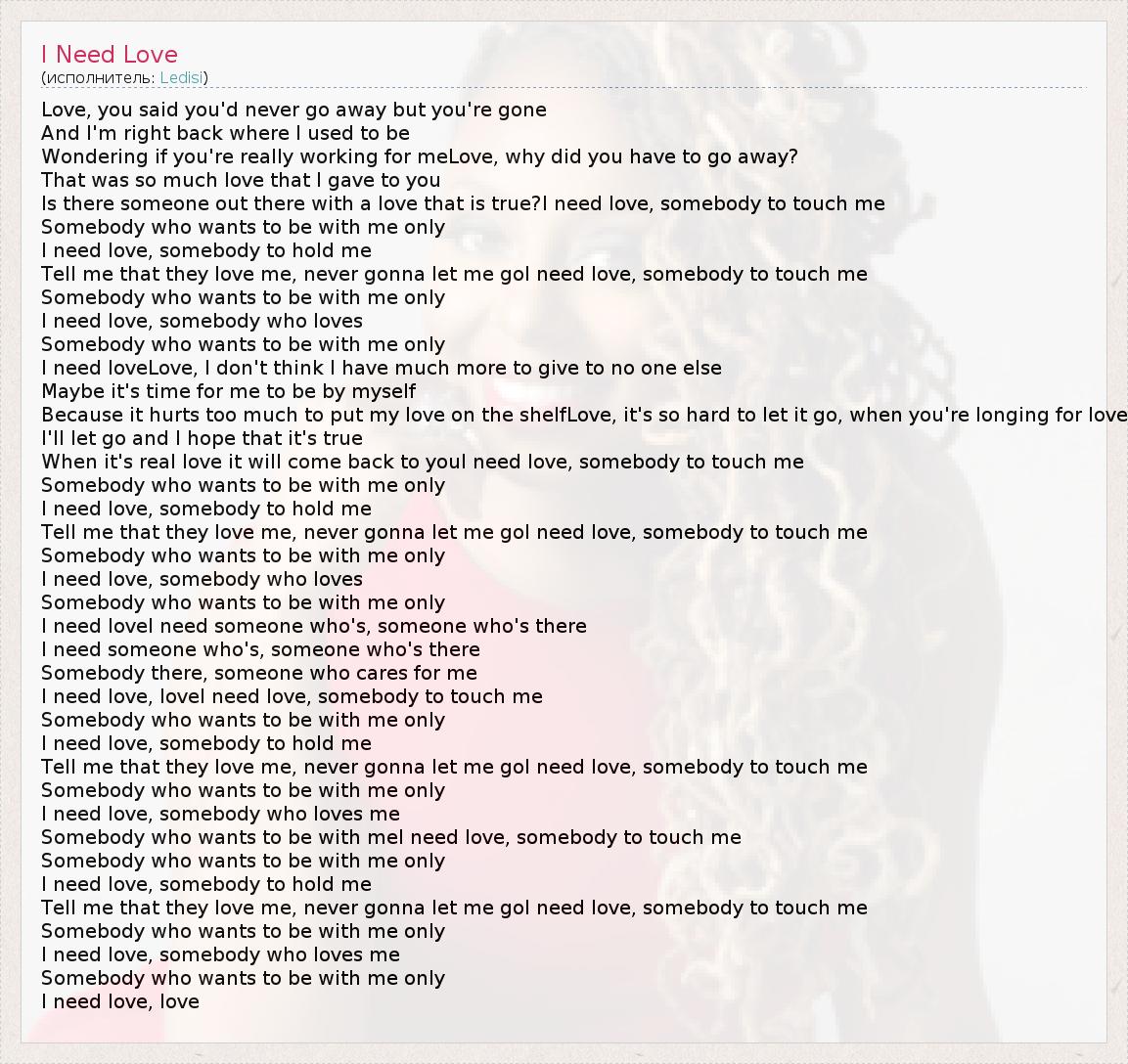 Tell me that they love me, never gonna let me goI need love, somebody to touch me