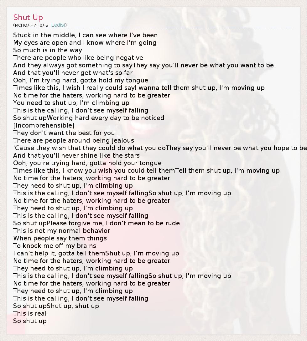 Stuck in the middle, I can see where I've been My eyes are open and I know where I'm going So much is in the way There are people who like being negative And they always got something to sayThey say you'll never be what you want to be And that you'll never get what's so far Ooh, I'm trying hard, gotta hold my tongue Times like this, I wish I really could sayI wanna tell them shut up, I'm moving up No time for the haters, working hard to be greater You need to shut up, I'm climbing up This is the calling, I don't see myself falling So shut upWorking hard every day to be noticed [Incomprehensible] They don't want the best for you There are people around being jealous 'Cause they wish that they could do what you doThey say you'll never be what you hope to be And that you'll never shine like the stars Ooh, you're trying hard, gotta hold your tongue Times like this, I know you wish you could tell themTell them shut up, I'm moving up No time for the haters, working hard to be greater They need to shut up, I'm climbing up This is the calling, I don't see myself fallingSo shut up, I'm moving up No time for the haters, working hard to be greater They need to shut up, I'm climbing up This is the calling, I don't see myself falling So shut upPlease forgive me, I don't mean to be rude This is not my normal behavior When people say them things To knock me off my brains I can't help it, gotta tell themShut up, I'm moving up No time for the haters, working hard to be greater They need to shut up, I'm climbing up This is the calling, I don't see myself fallingSo shut up, I'm moving up No time for the haters, working hard to be greater They need to shut up, I'm climbing up This is the calling, I don't see myself falling So shut upShut up, shut up This is real So shut up
