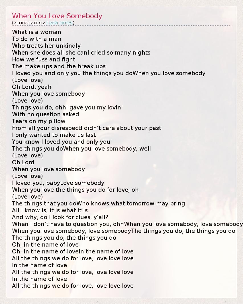 What is a woman To do with a man Who treats her unkindly When she does all she canI cried so many nights How we fuss and fight The make ups and the break ups I loved you and only you the things you doWhen you love somebody (Love love) Oh Lord, yeah When you love somebody (Love love) Things you do, ohhI gave you my lovin' With no question asked Tears on my pillow From all your disrespectI didn't care about your past I only wanted to make us last You know I loved you and only you The things you doWhen you love somebody, well (Love love) Oh Lord When you love somebody (Love love) I loved you, babyLove somebody When you love the things you do for love, oh (Love love) The things that you doWho knows what tomorrow may bring All I know is, it is what it is And why, do I look for clues, y'all? When I don't have to question you, ohhWhen you love somebody, love somebody When you love somebody, love somebodyThe things you do, the things you do The things you do, the things you do Oh, in the name of love Oh, in the name of loveIn the name of love All the things we do for love, love love love In the name of love All the things we do for love, love love love In the name of love All the things we do for love, love love love