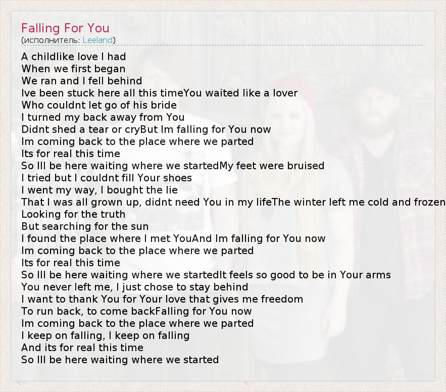 A childlike love I had When we first began We ran and I fell behind Ive been stuck here all this timeYou waited like a lover Who couldnt let go of his bride I turned my back away from You Didnt shed a tear or cryBut Im falling for You now Im coming back to the place where we parted Its for real this time So Ill be here waiting where we startedMy feet were bruised I tried but I couldnt fill Your shoes I went my way, I bought the lie That I was all grown up, didnt need You in my lifeThe winter left me cold and frozen Looking for the truth But searching for the sun I found the place where I met YouAnd Im falling for You now Im coming back to the place where we parted Its for real this time So Ill be here waiting where we startedIt feels so good to be in Your arms You never left me, I just chose to stay behind I want to thank You for Your love that gives me freedom To run back, to come backFalling for You now Im coming back to the place where we parted I keep on falling, I keep on falling And its for real this time So Ill be here waiting where we started