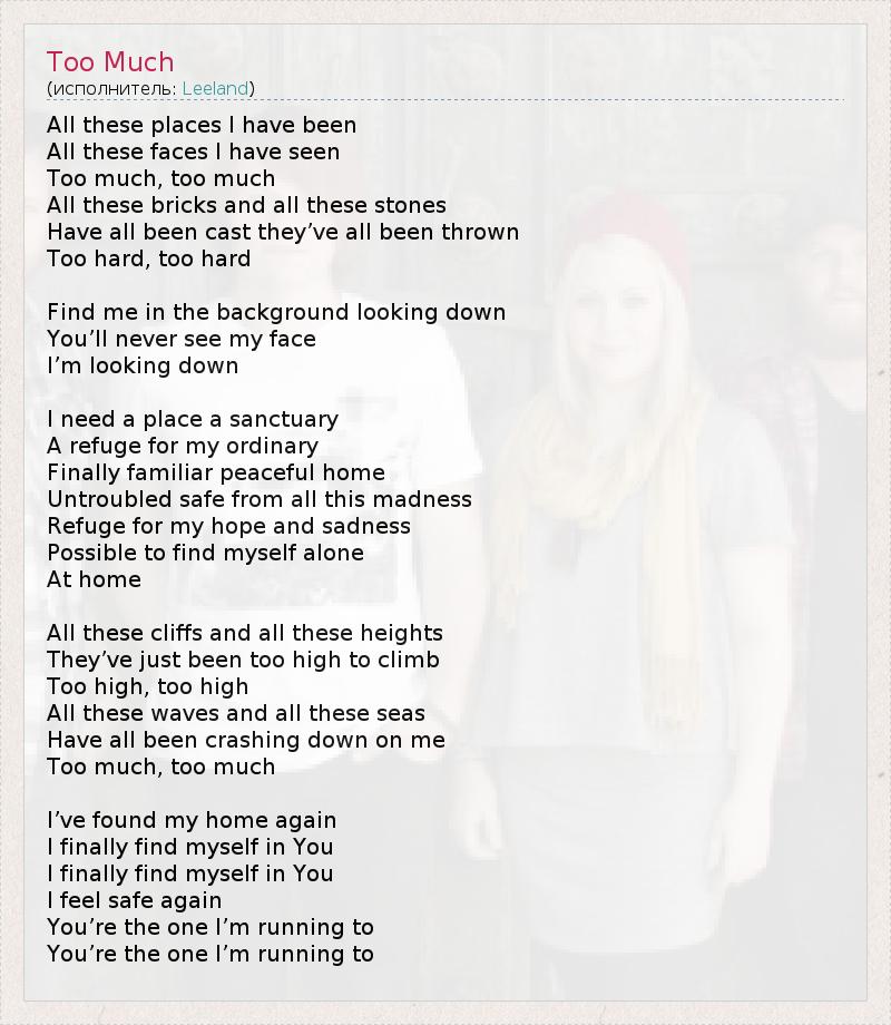 All these places I have been All these faces I have seen Too much, too much All these bricks and all these stones Have all been cast they’ve all been thrown Too hard, too hard Find me in the background looking down You’ll never see my face I’m looking down I need a place a sanctuary A refuge for my ordinary Finally familiar peaceful home Untroubled safe from all this madness Refuge for my hope and sadness Possible to find myself alone At home All these cliffs and all these heights They’ve just been too high to climb Too high, too high All these waves and all these seas Have all been crashing down on me Too much, too much I’ve found my home again I finally find myself in You I finally find myself in You I feel safe again You’re the one I’m running to You’re the one I’m running to