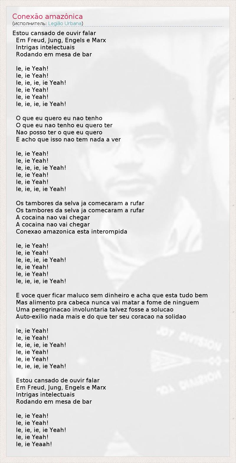 Estou cansado de ouvir falar Em Freud, Jung, Engels e Marx Intrigas intelectuais Rodando em mesa de bar Ie, ie Yeah! Ie, ie Yeah! Ie, ie, ie, ie Yeah! Ie, ie Yeah! Ie, ie Yeah! Ie, ie, ie, ie Yeah! O que eu quero eu nao tenho O que eu nao tenho eu quero ter Nao posso ter o que eu quero E acho que isso nao tem nada a ver Ie, ie Yeah! Ie, ie Yeah! Ie, ie, ie, ie Yeah! Ie, ie Yeah! Ie, ie Yeah! Ie, ie, ie, ie Yeah! Os tambores da selva ja comecaram a rufar Os tambores da selva ja comecaram a rufar A cocaina nao vai chegar A cocaina nao vai chegar Conexao amazonica esta interompida Ie, ie Yeah! Ie, ie Yeah! Ie, ie, ie, ie Yeah! Ie, ie Yeah! Ie, ie Yeah! Ie, ie, ie, ie Yeah! E voce quer ficar maluco sem dinheiro e acha que esta tudo bem Mas alimento pra cabeca nunca vai matar a fome de ninguem Uma peregrinacao involuntaria talvez fosse a solucao Auto-exilio nada mais e do que ter seu coracao na solidao Ie, ie Yeah! Ie, ie Yeah! Ie, ie, ie, ie Yeah! Ie, ie Yeah! Ie, ie Yeah! Ie, ie, ie, ie Yeah! Estou cansado de ouvir falar Em Freud, Jung, Engels e Marx Intrigas intelectuais Rodando em mesa de bar Ie, ie Yeah! Ie, ie Yeah! Ie, ie, ie, ie Yeah! Ie, ie Yeah! Ie, ie Yeaah!