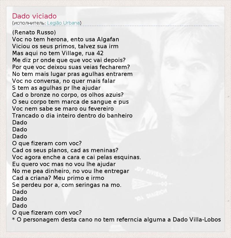(Renato Russo) Voc no tem herona, ento usa Algafan Viciou os seus primos, talvez sua irm Mas aqui no tem Village, rua 42 Me diz pr onde que que voc vai depois? Por que voc deixou suas veias fecharem? No tem mais lugar pras agulhas entrarem Voc no conversa, no quer mais falar S tem as agulhas pr lhe ajudar Cad o bronze no corpo, os olhos azuis? O seu corpo tem marca de sangue e pus Voc nem sabe se maro ou fevereiro Trancado o dia inteiro dentro do banheiro Dado Dado Dado O que fizeram com voc? Cad os seus planos, cad as meninas? Voc agora enche a cara e cai pelas esquinas. Eu quero voc mas no vou lhe ajudar No me pea dinheiro, no vou lhe entregar Cad a criana? Meu primo e irmo Se perdeu por a, com seringas na mo. Dado Dado Dado O que fizeram com voc? * O personagem desta cano no tem referncia alguma a Dado Villa-Lobos