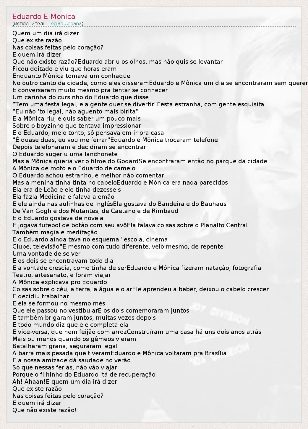 А как ты думаешь, о чем песня "Eduardo E Monica" ?