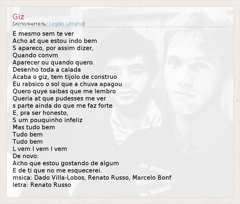 E mesmo sem te ver Acho at que estou indo bem S apareco, por assim dizer, Quando convm Aparecer ou quando quero. Desenho toda a calada Acaba o giz, tem tijolo de construo Eu rabsico o sol que a chuva apagou Quero quye saibas que me lembro Queria at que pudesses me ver s parte ainda do que me faz forte E, pra ser honesto, S um pouquinho infeliz Mas tudo bem Tudo bem Tudo bem L vem l vem l vem De novo: Acho que estou gostando de algum E de ti que no me esquecerei. msica: Dado Villa-Lobos, Renato Russo, Marcelo Bonf letra: Renato Russo