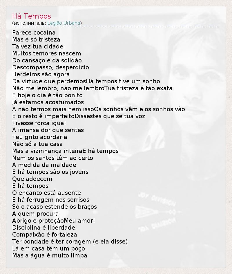 Parece cocaína Mas é só tristeza Talvez tua cidade Muitos temores nascem Do cansaço e da solidão Descompasso, desperdício Herdeiros são agora Da virtude que perdemosHá tempos tive um sonho Não me lembro, não me lembroTua tristeza é tão exata E hoje o dia é tão bonito Já estamos acostumados A não termos mais nem issoOs sonhos vêm e os sonhos vão E o resto é imperfeitoDissestes que se tua voz Tivesse força igual À imensa dor que sentes Teu grito acordaria Não só a tua casa Mas a vizinhança inteiraE há tempos Nem os santos têm ao certo A medida da maldade E há tempos são os jovens Que adoecem E há tempos O encanto está ausente E há ferrugem nos sorrisos Só o acaso estende os braços A quem procura Abrigo e proteçãoMeu amor! Disciplina é liberdade Compaixão é fortaleza Ter bondade é ter coragem (e ela disse) Lá em casa tem um poço Mas a água é muito limpa