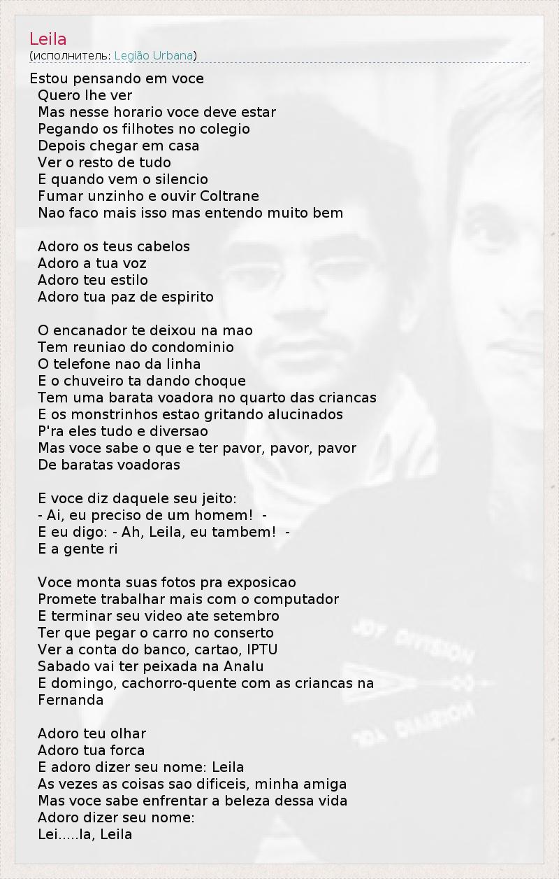 Estou pensando em voce Quero lhe ver Mas nesse horario voce deve estar Pegando os filhotes no colegio Depois chegar em casa Ver o resto de tudo E quando vem o silencio Fumar unzinho e ouvir Coltrane Nao faco mais isso mas entendo muito bem Adoro os teus cabelos Adoro a tua voz Adoro teu estilo Adoro tua paz de espirito O encanador te deixou na mao Tem reuniao do condominio O telefone nao da linha E o chuveiro ta dando choque Tem uma barata voadora no quarto das criancas E os monstrinhos estao gritando alucinados P'ra eles tudo e diversao Mas voce sabe o que e ter pavor, pavor, pavor De baratas voadoras E voce diz daquele seu jeito: - Ai, eu preciso de um homem! - E eu digo: - Ah, Leila, eu tambem! - E a gente ri Voce monta suas fotos pra exposicao Promete trabalhar mais com o computador E terminar seu video ate setembro Ter que pegar o carro no conserto Ver a conta do banco, cartao, IPTU Sabado vai ter peixada na Analu E domingo, cachorro-quente com as criancas na Fernanda Adoro teu olhar Adoro tua forca E adoro dizer seu nome: Leila As vezes as coisas sao dificeis, minha amiga Mas voce sabe enfrentar a beleza dessa vida Adoro dizer seu nome: Lei.....la, Leila