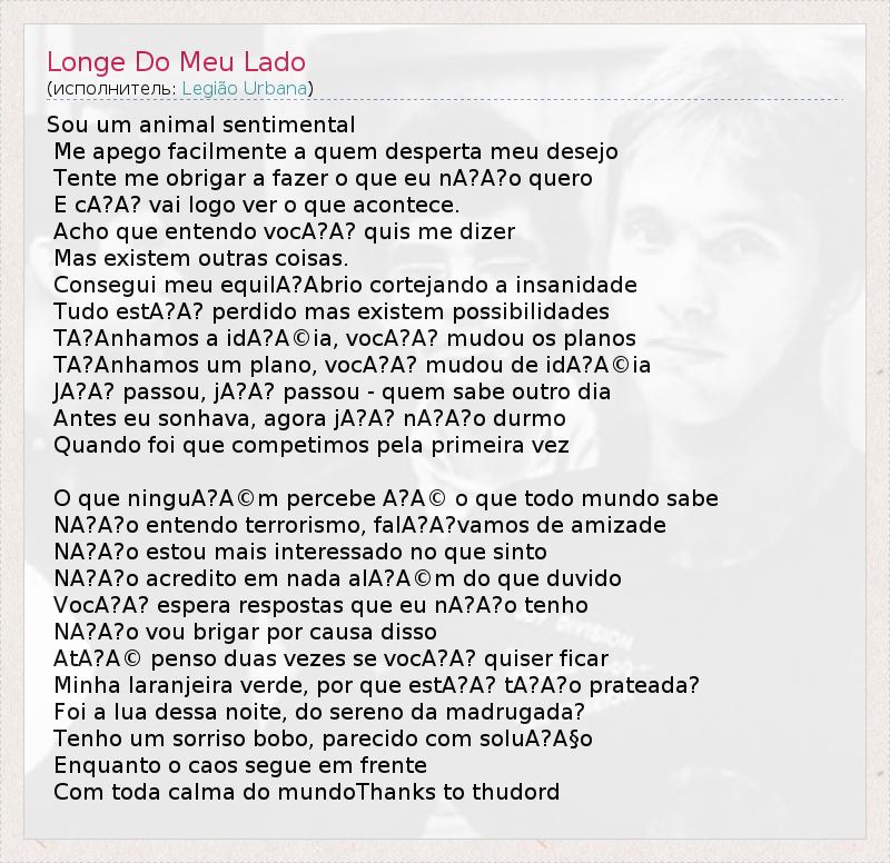 Sou um animal sentimental Me apego facilmente a quem desperta meu desejo Tente me obrigar a fazer o que eu nA?A?o quero E cA?A? vai logo ver o que acontece. Acho que entendo vocA?A? quis me dizer Mas existem outras coisas. Consegui meu equilA?Abrio cortejando a insanidade Tudo estA?A? perdido mas existem possibilidades TA?Anhamos a idA?A©ia, vocA?A? mudou os planos TA?Anhamos um plano, vocA?A? mudou de idA?A©ia JA?A? passou, jA?A? passou - quem sabe outro dia Antes eu sonhava, agora jA?A? nA?A?o durmo Quando foi que competimos pela primeira vez O que ninguA?A©m percebe A?A© o que todo mundo sabe NA?A?o entendo terrorismo, falA?A?vamos de amizade NA?A?o estou mais interessado no que sinto NA?A?o acredito em nada alA?A©m do que duvido VocA?A? espera respostas que eu nA?A?o tenho NA?A?o vou brigar por causa disso AtA?A© penso duas vezes se vocA?A? quiser ficar Minha laranjeira verde, por que estA?A? tA?A?o prateada? Foi a lua dessa noite, do sereno da madrugada? Tenho um sorriso bobo, parecido com soluA?A§o Enquanto o caos segue em frente Com toda calma do mundoThanks to thudord