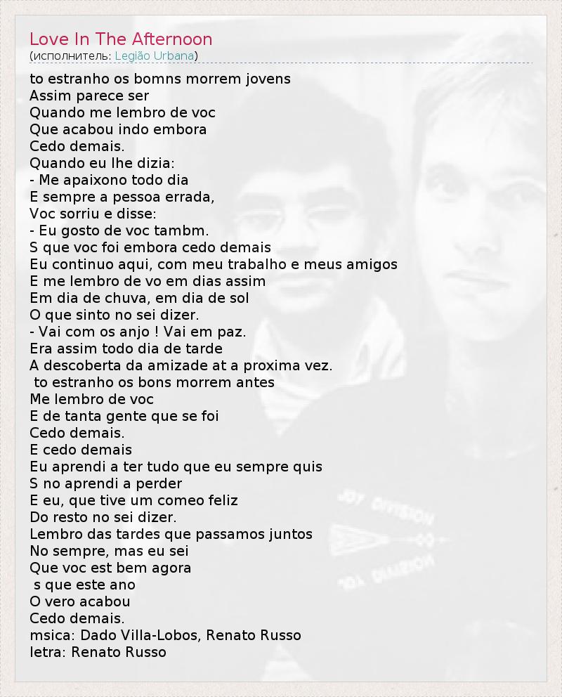 to estranho os bomns morrem jovens Assim parece ser Quando me lembro de voc Que acabou indo embora Cedo demais. Quando eu lhe dizia: - Me apaixono todo dia E sempre a pessoa errada, Voc sorriu e disse: - Eu gosto de voc tambm. S que voc foi embora cedo demais Eu continuo aqui, com meu trabalho e meus amigos E me lembro de vo em dias assim Em dia de chuva, em dia de sol O que sinto no sei dizer. - Vai com os anjo ! Vai em paz. Era assim todo dia de tarde A descoberta da amizade at a proxima vez. to estranho os bons morrem antes Me lembro de voc E de tanta gente que se foi Cedo demais. E cedo demais Eu aprendi a ter tudo que eu sempre quis S no aprendi a perder E eu, que tive um comeo feliz Do resto no sei dizer. Lembro das tardes que passamos juntos No sempre, mas eu sei Que voc est bem agora s que este ano O vero acabou Cedo demais. msica: Dado Villa-Lobos, Renato Russo letra: Renato Russo