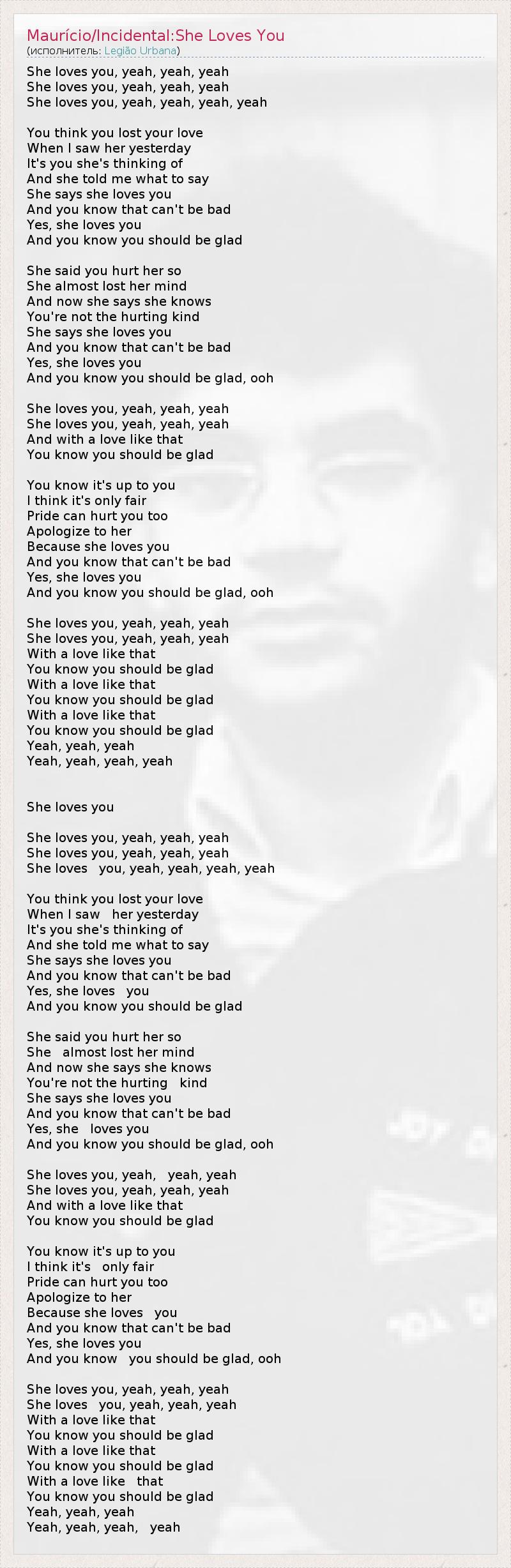 Она любит тебя, да, да, да! Она любит тебя, да, да, да! Она любит тебя, да, да, да, да! Ты думаешь, что потерял свою любовь. Когда я видел её вчера, Ты – то, о чем она думает. И она сказала мне, что передать. Она говорит, что любит тебя И ты знаешь, что это не может быть плохо. Да, она любит тебя. И ты знаешь, что ты будешь рад. Она сказала, что так ты причиняешь ей боль. Она почти сошла с ума. И теперь она сказала, что знает: Ты не выглядишь страдающим. Она говорит, что любит тебя И ты знаешь, что это не может быть плохо. Да, она любит тебя. И ты знаешь, что ты будешь рад. Она любит тебя, да, да, да! Она любит тебя, да, да, да! И с такой любовью, как эта, Ты знаешь, что будешь рад. И теперь тебе решать. Я думаю, что только это справедливо. Гордость может причинить боль и тебе - Извинись перед ней. Потому что она любит тебя. И ты знаешь, что это не может быть плохо. Да, она любит тебя. И ты знаешь, что это не может быть плохо. Ух! Она любит тебя, да, да, да! Она любит тебя, да, да, да! С такой любовью, как эта, Ты знаешь, что будешь рад. С такой любовью, как эта, Ты знаешь, что будешь рад. С такой любовью, как эта, Ты знаешь, что будешь рад. Да, да, да! Да, да, да, да! Она любит тебя (Rust из Москва) Она твоя, да, да, Она твоя, да, да, Она твоя, да, да, да. Ты думаешь вчера Ты потерял любовь. Но только про тебя Она расспрашивает вновь. Она же любит тебя, Ты это знаешь хорошо, Что она любит тебя, Так почему же ты ушел? Ты сердце ей разбил, Она почти сошла с ума. И думает тебе, Что она больше не нужна. Она же любит тебя, Ты это знаешь хорошо, Что она любит тебя, Ну почему же ты ушел? О-о! Она твоя, да, да, Она твоя, да, да, И счастлив с ней Ты будешь навсегда. Теперь скорей решай Иль гордость сохранять, Иль извинись, давай, Что бы ее не потерять. Она же любит тебя, Ты это знаешь хорошо, Что она любит тебя. В ней свое счастье ты нашел, о-о! Она твоя, да, да, Она твоя, да, да, Обида - не беда, Будь счастлив с ней всегда. С такою, как она, Будь счастлив навсегда, С такою, как она, Будь счастлив навсегда. Да, да, да! Да, да, да, да!
