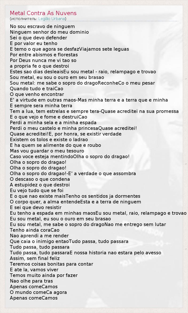 No sou escravo de ninguem Ninguem senhor do meu dominio Sei o que devo defender E por valor eu tenho E temo o que agora se desfazViajamos sete leguas Por entre abismos e florestas Por Deus nunca me vi tao so a propria fe o que destroi Estes sao dias desleaisEu sou metal - raio, relampago e trovao Sou metal, eu sou o ouro em seu brasao Sou metal: me sabe o sopro do dragoReconheCo o meu pesar Quando tudo e traiCao O que venho encontrar E' a virtude em outras maos-Mas minha terra e a terra que e minha E sempre sera minha terra Tem a lua, tem estrelas e sempre tera-Quase acreditei na sua promessa E o que vejo e fome e destruiCao Perdi a minha sela e a minha espada Perdi o meu castelo e minha princesaQuase acreditei! Quase acreditei!E, por honra, se existir verdade Existem os tolos e existe o ladrao E ha quem se alimente do que e roubo Mas vou guardar o meu tesouro Caso voce esteja mentindoOlha o sopro do dragao! Olha o sopro do dragao! Olha o sopro do dragao! Olha o sopro do dragao!-E' a verdade o que assombra O descaso o que condena A estupidez o que destroi Eu vejo tudo que se foi E o que nao existe maisTenho os sentidos ja dormentes O corpo quer, a alma entendeEsta e a terra de ninguem E sei que devo resistir Eu tenho a espada em minhas maosEu sou metal, raio, relampago e trovao Eu sou metal, eu sou o ouro em seu brasao Eu sou metal, me sabe o sopro do dragoNao me entrego sem lutar Tenho ainda coraCao Nao aprendi a me render Que caia o inimigo entaoTudo passa, tudo passara Tudo passa, tudo passara Tudo passa, tudo passaraE nossa historia nao estara pelo avesso Assim, sem final feliz Teremos coisas bonitas para contar E ate la, vamos viver Temos muito ainda por fazer Nao olhe para tras Apenas comeCamos O mundo comeCa agora Apenas comeCamos