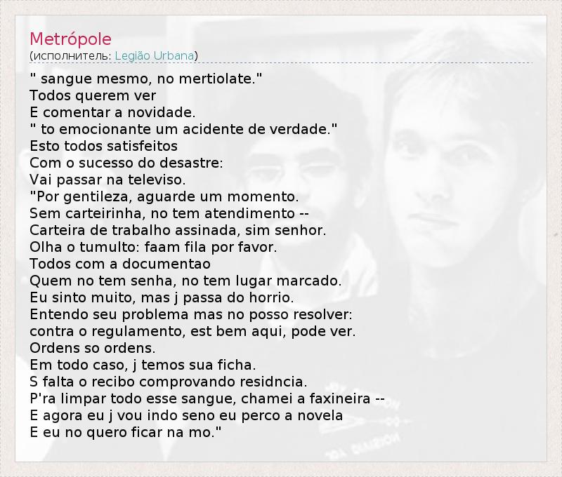 " sangue mesmo, no mertiolate." Todos querem ver E comentar a novidade. " to emocionante um acidente de verdade." Esto todos satisfeitos Com o sucesso do desastre: Vai passar na televiso. "Por gentileza, aguarde um momento. Sem carteirinha, no tem atendimento -- Carteira de trabalho assinada, sim senhor. Olha o tumulto: faam fila por favor. Todos com a documentao Quem no tem senha, no tem lugar marcado. Eu sinto muito, mas j passa do horrio. Entendo seu problema mas no posso resolver: contra o regulamento, est bem aqui, pode ver. Ordens so ordens. Em todo caso, j temos sua ficha. S falta o recibo comprovando residncia. P'ra limpar todo esse sangue, chamei a faxineira -- E agora eu j vou indo seno eu perco a novela E eu no quero ficar na mo."
