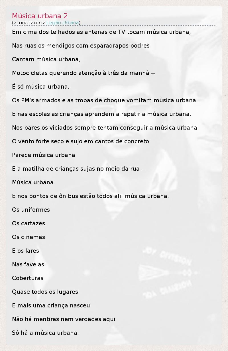 Em cima dos telhados as antenas de TV tocam música urbana, Nas ruas os mendigos com esparadrapos podres Cantam música urbana, Motocicletas querendo atenção à três da manhã -- É só música urbana. Os PM's armados e as tropas de choque vomitam música urbana E nas escolas as crianças aprendem a repetir a música urbana. Nos bares os viciados sempre tentam conseguir a música urbana. O vento forte seco e sujo em cantos de concreto Parece música urbana E a matilha de crianças sujas no meio da rua -- Música urbana. E nos pontos de ônibus estão todos ali: música urbana. Os uniformes Os cartazes Os cinemas E os lares Nas favelas Coberturas Quase todos os lugares. E mais uma criança nasceu. Não há mentiras nem verdades aqui Só há a música urbana.