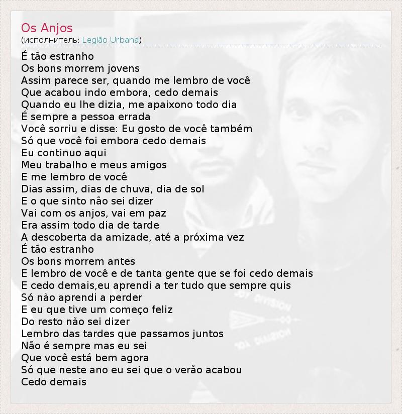 Э. Тао estranho Os боны morrem jovens Assim parece сер , Quando мне lembro де você Que acabou индо embora , CeDo demais Quando ЕС LHe dizia , мне apaixono TODO диаметром Э. SemperПессоа errada Você sorriu электронной Диссе : Eu Gosto де você também Só Que você свободе информации embora CeDo demais Eu континуо Aqui Meu Trabalho электронной Meus Amigos E меня lembro де você Диас assim , Диас де chuva , Диа-де- Соль Е о Que синто não сеи Дизер Вай ком ОС Anjos , Вай EM -Пас Эра assim TODO Диа-де- Тард Descoberta да Amizade , съел Проксима Чавес Э. Тао estranho Os боны morrem анте E lembro де você электронной де Танта Gente Que SE свободе информации CeDo demais E CeDo demais , ЕС aprendi тер Тудо Que Semper Quis Só não aprendiPerder E ЕС Que ный мкм Comeco Feliz У Ресто não Sei Дизер Lembro дас tardes Que passamos Juntos Não é Semper Рождество ЕС сеи Que você está BEM агора Só Que Neste АНО ЕС сеи Que о Verão acabou Cedo demais
