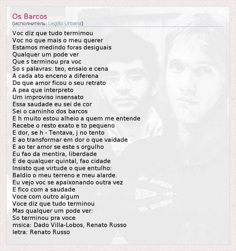 Voc diz que tudo termimou Voc no que mais o meu querer Estamos medindo foras desiguais Qualquer um pode ver Que s terminou pra voc So s palavras: teo, ensaio e cena A cada ato enceno a diferena Do que amor ficou o seu retrato A pea que interpreto Um improviso insensato Essa saudade eu sei de cor Sei o caminho dos barcos E h muito estou alheio a quem me entende Recebe o resto exato e to pequeno E dor, se h - Tentava, j no tento E ao transformar em dor o que vaidade E ao ter amor se este s orgulho Eu fao da mentira, liberdade E de qualquer quintal, fao cidade Insisto que virtude o que entulho: Baldio o meu terreno e meu alarde. Eu vejo voc se apaixonando outra vez E fico com a saudade Voce com outro algum Voce diz que tudo terminou Mas qualquer um pode ver: So terminou pra voce msica: Dado Villa-Lobos, Renato Russo letra: Renato Russo