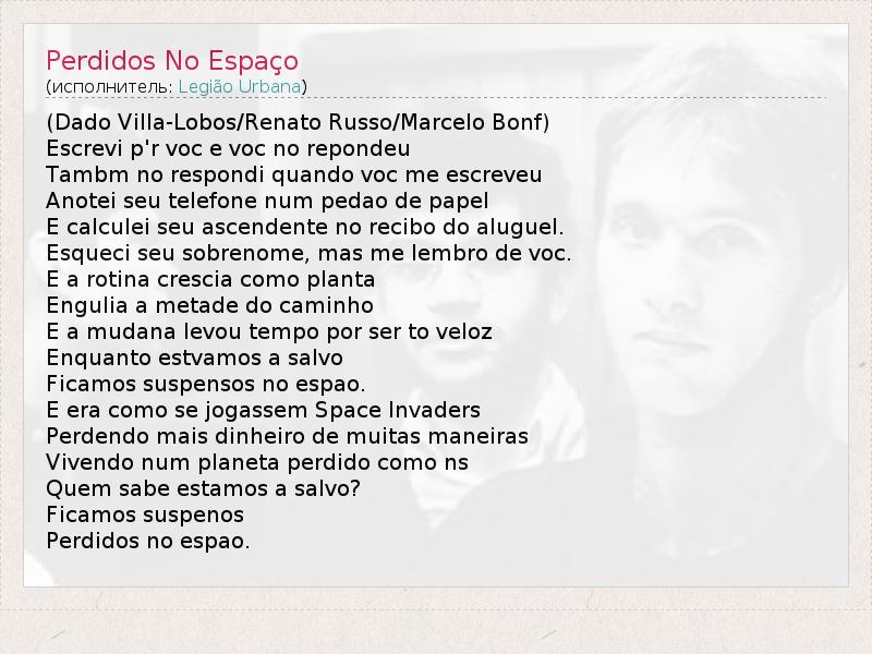 (Dado Villa-Lobos/Renato Russo/Marcelo Bonf) Escrevi p'r voc e voc no repondeu Tambm no respondi quando voc me escreveu Anotei seu telefone num pedao de papel E calculei seu ascendente no recibo do aluguel. Esqueci seu sobrenome, mas me lembro de voc. E a rotina crescia como planta Engulia a metade do caminho E a mudana levou tempo por ser to veloz Enquanto estvamos a salvo Ficamos suspensos no espao. E era como se jogassem Space Invaders Perdendo mais dinheiro de muitas maneiras Vivendo num planeta perdido como ns Quem sabe estamos a salvo? Ficamos suspenos Perdidos no espao.