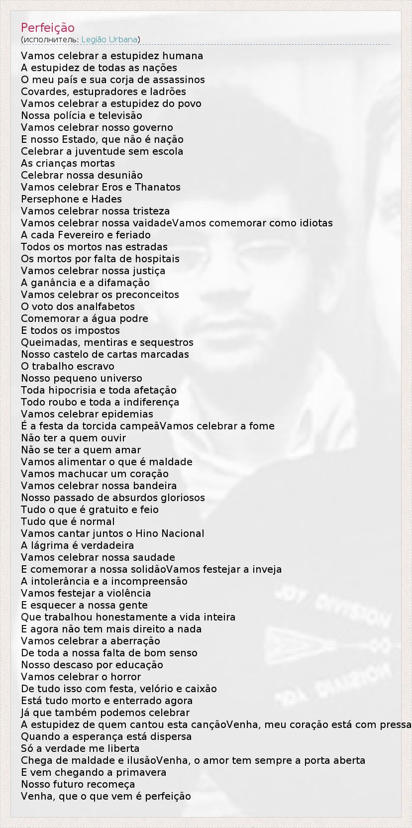 Vamos celebrar a estupidez humana A estupidez de todas as nações O meu país e sua corja de assassinos Covardes, estupradores e ladrões Vamos celebrar a estupidez do povo Nossa polícia e televisão Vamos celebrar nosso governo E nosso Estado, que não é nação Celebrar a juventude sem escola As crianças mortas Celebrar nossa desunião Vamos celebrar Eros e Thanatos Persephone e Hades Vamos celebrar nossa tristeza Vamos celebrar nossa vaidadeVamos comemorar como idiotas A cada Fevereiro e feriado Todos os mortos nas estradas Os mortos por falta de hospitais Vamos celebrar nossa justiça A ganância e a difamação Vamos celebrar os preconceitos O voto dos analfabetos Comemorar a água podre E todos os impostos Queimadas, mentiras e sequestros Nosso castelo de cartas marcadas O trabalho escravo Nosso pequeno universo Toda hipocrisia e toda afetação Todo roubo e toda a indiferença Vamos celebrar epidemias É a festa da torcida campeãVamos celebrar a fome Não ter a quem ouvir Não se ter a quem amar Vamos alimentar o que é maldade Vamos machucar um coração Vamos celebrar nossa bandeira Nosso passado de absurdos gloriosos Tudo o que é gratuito e feio Tudo que é normal Vamos cantar juntos o Hino Nacional A lágrima é verdadeira Vamos celebrar nossa saudade E comemorar a nossa solidãoVamos festejar a inveja A intolerância e a incompreensão Vamos festejar a violência E esquecer a nossa gente Que trabalhou honestamente a vida inteira E agora não tem mais direito a nada Vamos celebrar a aberração De toda a nossa falta de bom senso Nosso descaso por educação Vamos celebrar o horror De tudo isso com festa, velório e caixão Está tudo morto e enterrado agora Já que também podemos celebrar A estupidez de quem cantou esta cançãoVenha, meu coração está com pressa Quando a esperança está dispersa Só a verdade me liberta Chega de maldade e ilusãoVenha, o amor tem sempre a porta aberta E vem chegando a primavera Nosso futuro recomeça Venha, que o que vem é perfeição