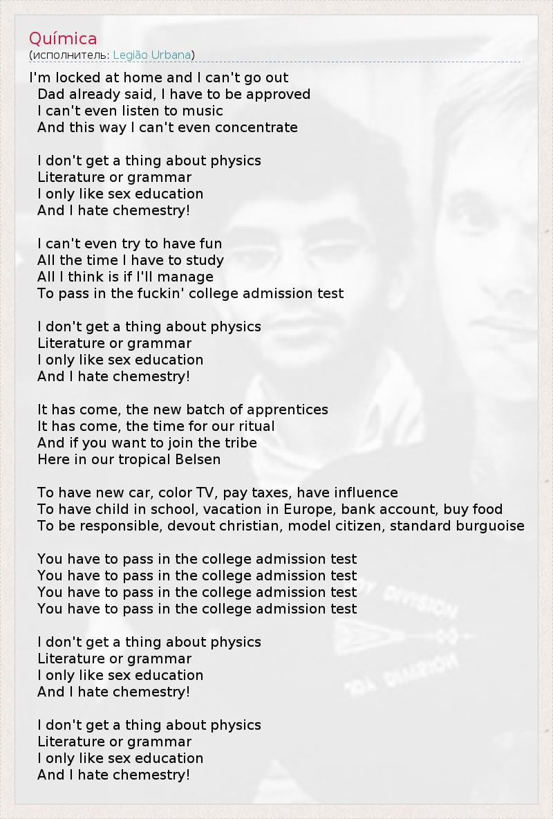 I'm locked at home and I can't go out Dad already said, I have to be approved I can't even listen to music And this way I can't even concentrate I don't get a thing about physics Literature or grammar I only like sex education And I hate chemestry! I can't even try to have fun All the time I have to study All I think is if I'll manage To pass in the fuckin' college admission test I don't get a thing about physics Literature or grammar I only like sex education And I hate chemestry! It has come, the new batch of apprentices It has come, the time for our ritual And if you want to join the tribe Here in our tropical Belsen To have new car, color TV, pay taxes, have influence To have child in school, vacation in Europe, bank account, buy food To be responsible, devout christian, model citizen, standard burguoise You have to pass in the college admission test You have to pass in the college admission test You have to pass in the college admission test You have to pass in the college admission test I don't get a thing about physics Literature or grammar I only like sex education And I hate chemestry! I don't get a thing about physics Literature or grammar I only like sex education And I hate chemestry!
