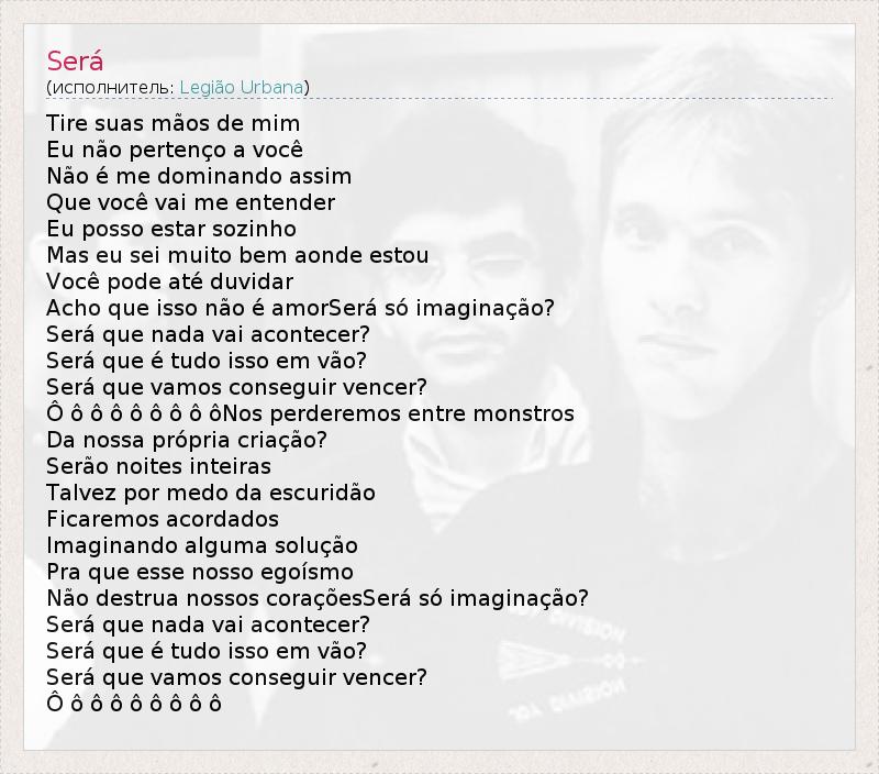Tire suas mãos de mim Eu não pertenço a você Não é me dominando assim Que você vai me entender Eu posso estar sozinho Mas eu sei muito bem aonde estou Você pode até duvidar Acho que isso não é amorSerá só imaginação? Será que nada vai acontecer? Será que é tudo isso em vão? Será que vamos conseguir vencer? Ô ô ô ô ô ô ô ô ôNos perderemos entre monstros Da nossa própria criação? Serão noites inteiras Talvez por medo da escuridão Ficaremos acordados Imaginando alguma solução Pra que esse nosso egoísmo Não destrua nossos coraçõesSerá só imaginação? Será que nada vai acontecer? Será que é tudo isso em vão? Será que vamos conseguir vencer? Ô ô ô ô ô ô ô ô ô