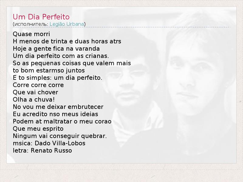 Quase morri H menos de trinta e duas horas atrs Hoje a gente fica na varanda Um dia perfeito com as crianas. So as pequenas coisas que valem mais to bom estarmso juntos E to simples: um dia perfeito. Corre corre corre Que vai chover Olha a chuva! No vou me deixar embrutecer Eu acredito nso meus ideias Podem at maltratar o meu corao Que meu esprito Ningum vai conseguir quebrar. msica: Dado Villa-Lobos letra: Renato Russo