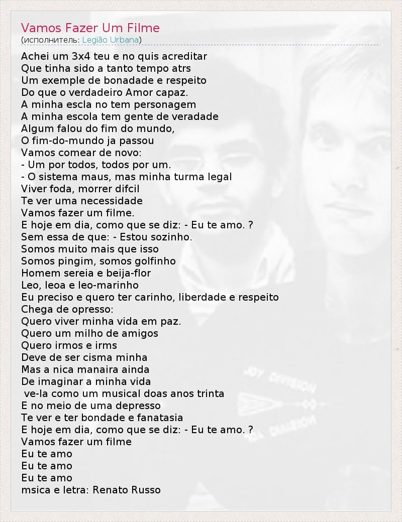 Achei um 3x4 teu e no quis acreditar Que tinha sido a tanto tempo atrs Um exemple de bonadade e respeito Do que o verdadeiro Amor capaz. A minha escla no tem personagem A minha escola tem gente de veradade Algum falou do fim do mundo, O fim-do-mundo ja passou Vamos comear de novo: - Um por todos, todos por um. - O sistema maus, mas minha turma legal Viver foda, morrer difcil Te ver uma necessidade Vamos fazer um filme. E hoje em dia, como que se diz: - Eu te amo. ? Sem essa de que: - Estou sozinho. Somos muito mais que isso Somos pingim, somos golfinho Homem sereia e beija-flor Leo, leoa e leo-marinho Eu preciso e quero ter carinho, liberdade e respeito Chega de opresso: Quero viver minha vida em paz. Quero um milho de amigos Quero irmos e irms Deve de ser cisma minha Mas a nica manaira ainda De imaginar a minha vida ve-la como um musical doas anos trinta E no meio de uma depresso Te ver e ter bondade e fanatasia E hoje em dia, como que se diz: - Eu te amo. ? Vamos fazer um filme Eu te amo Eu te amo Eu te amo msica e letra: Renato Russo