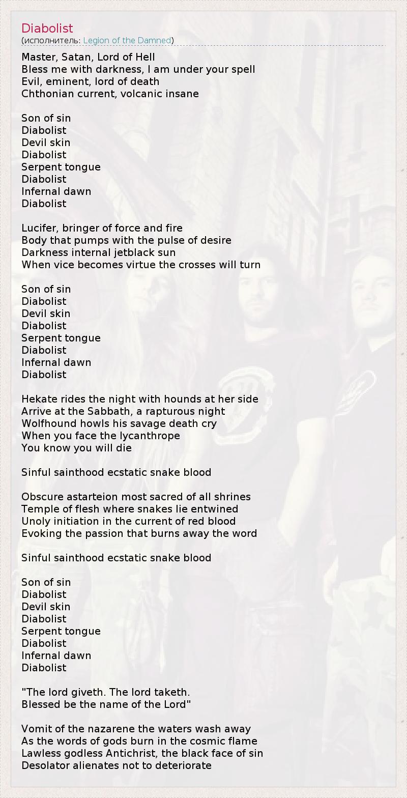 Это интересно:В то время как ветераны thrash metal изо всех сил стараются вернуть себе былое величие и славу, разбавляя творчество современными музыкальными элементами и совершенно нехарактерным исполнением композиций, голландская группа Legion of the Damned напротив — черпает вдохновение в классических, образцовых произведениях. Она — всепоглощающий thrash metal в лучших традициях родоначальников, таких, как Slayer... продолжение