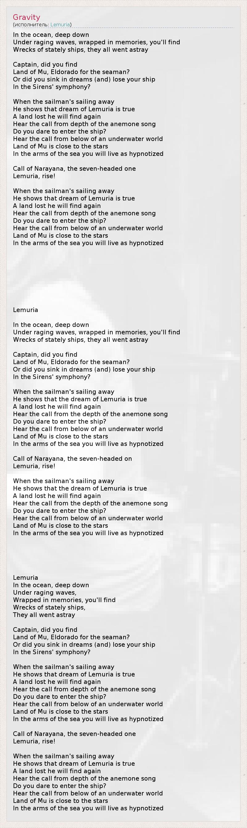 *Лемурия (страна Му) – мифический остров (или материк) в Индийском океане. Упоминание о Лемурии как о земле в Индийском океане с развитой цивилизацией встречается в мифологии разных народов. В 1926 г. полковник бенгальских улан Джеймс Чёрчвард заявил, что один индийский монах показал ему древние таблицы, в которых упоминался континент Му (Лемурия), простиравшийся на 6000 км от северной оконечности Гавайских островов до острова Пасхи. Согласно Чёрчварду, извержение вулканов, землетрясения и высокие волны уничтожили Лемурию примерно 12 000 лет назад. Мелкие острова были раскиданы по Тихому океану, а от выживших лемурийцев произошли все народы.(ru.wikipedia.org)