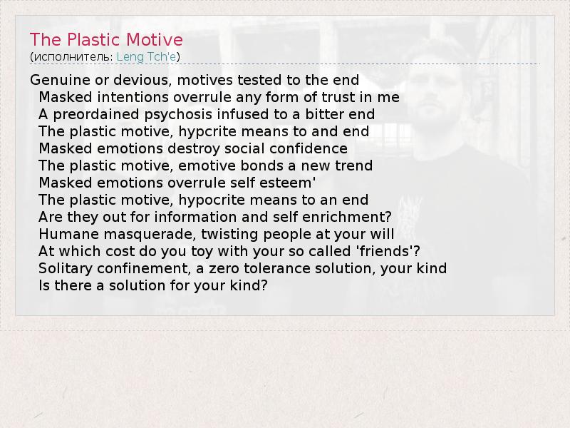 А как ты думаешь, о чем песня "The Plastic Motive" ?