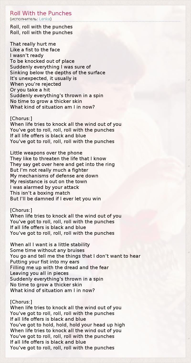 Roll, roll with the punches Roll, roll with the punches That really hurt me Like a fist to the face I wasn't ready To be knocked out of place Suddenly everything I was sure of Sinking below the depths of the surface It's unexpected, it usually is When you're rejected Or you take a hit Suddenly everything's thrown in a spin No time to grow a thicker skin What kind of situation am I in now? [Chorus:] When life tries to knock all the wind out of you You've got to roll, roll, roll with the punches If all life offers is black and blue You've got to roll, roll, roll with the punches Little weapons over the phone They like to threaten the life that I know They say get over here and get into the ring But I'm not really much a fighter My mechanisms of defense are down My resistance is out on the town I was alarmed by your attack This isn't a boxing match But I'll be damned if I ever let you win [Chorus:] When life tries to knock all the wind out of you You've got to roll, roll, roll with the punches If all life offers is black and blue You've got to roll, roll, roll with the punches When all I want is a little stability Some time without any bruises You go and tell me the things that I don't want to hear Putting your fist into my ears Filling me up with the dread and the fear Leaving you all in pieces Suddenly everything's thrown in a spin No time to grow a thicker skin What kind of situation am I in now? [Chorus:] When life tries to knock all the wind out of you You've got to roll, roll, roll with the punches If all life offers is black and blue You've got to hold, hold, hold your head up high When life tries to knock all the wind out of you You've got to roll, roll, roll with the punches If all life offers is black and blue You've got to roll, roll, roll with the punches